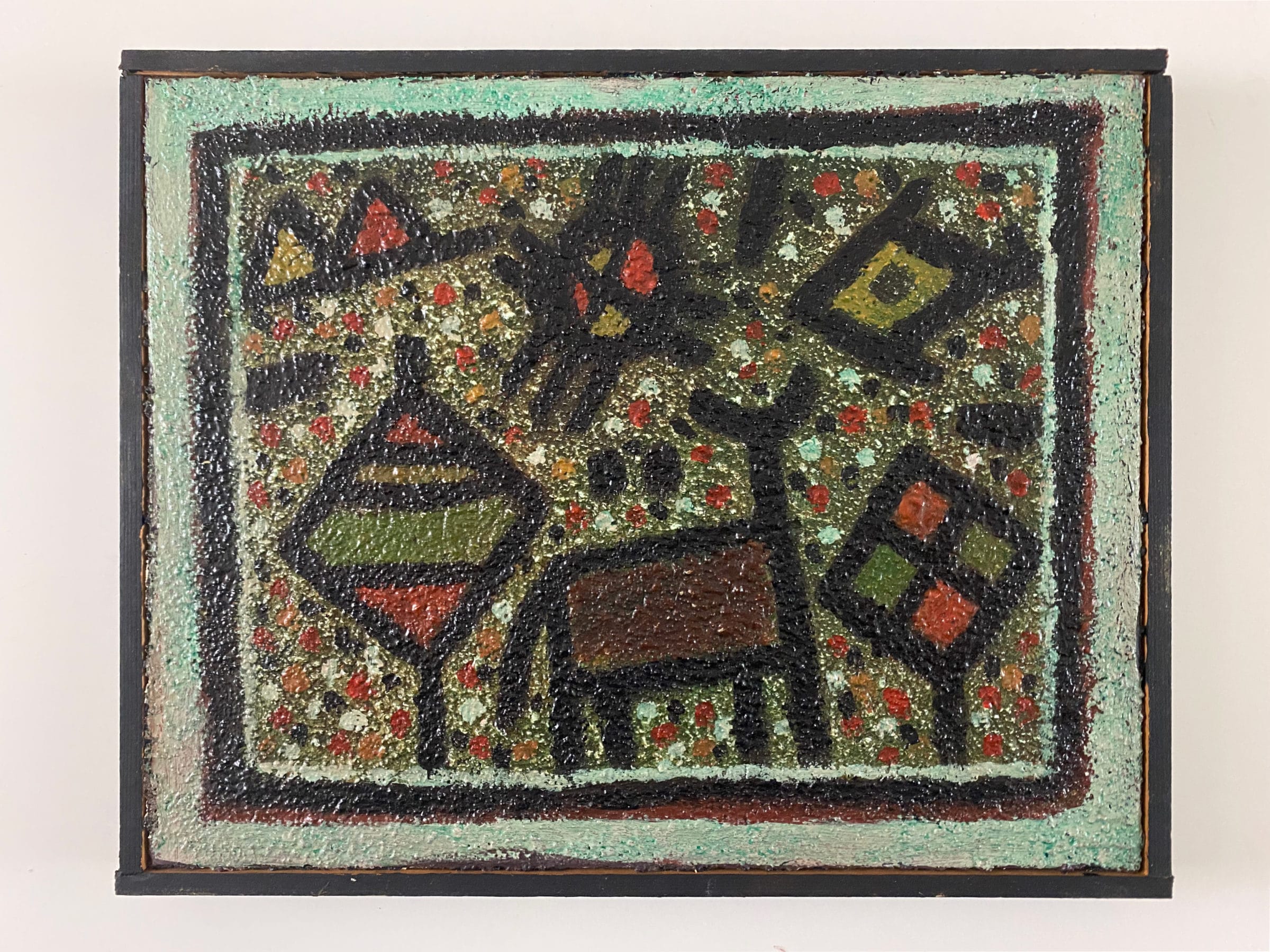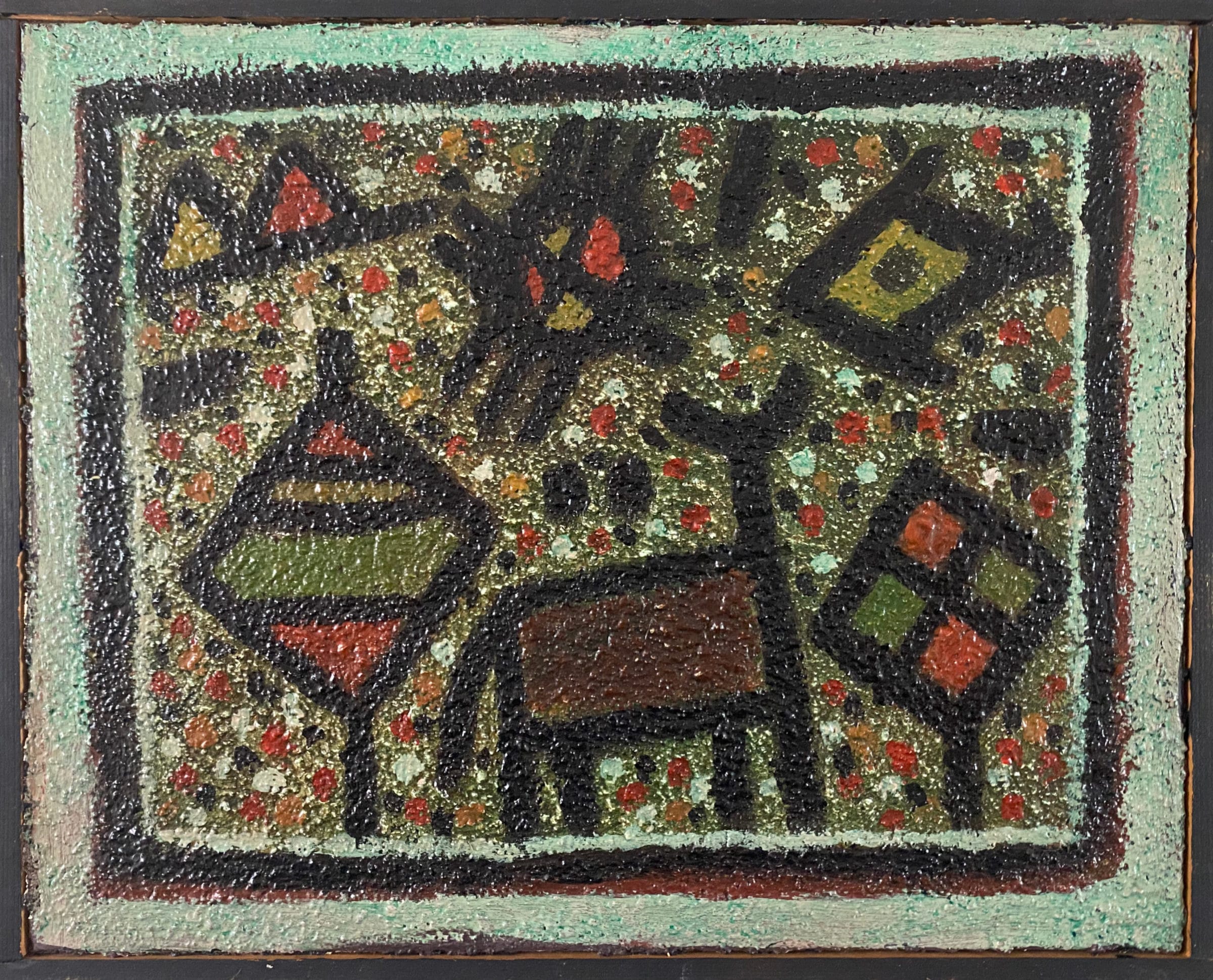 Een werk zonder titel in acrylverf op hardboard met dierfiguren en symbolen van de Hongaars-Nederlandse kunstenaar Ferenc Gögös in eigen lijsting.