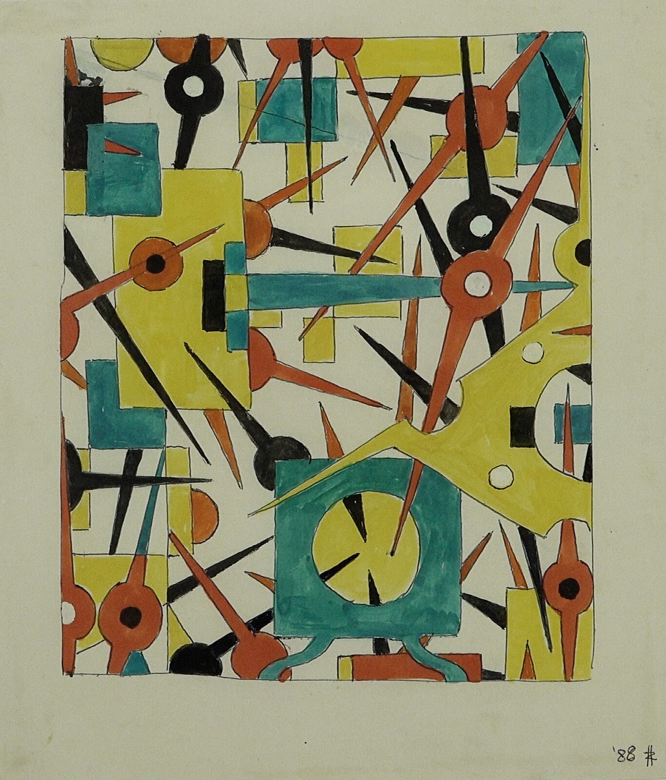 Abstracte gouache zonder titel op papier van de bekende Oosterbeekse beeldhouwer Henk Zweerus, in houten lijst met passe-partout achter glas. Het werk is gedateerd en geparafeerd.