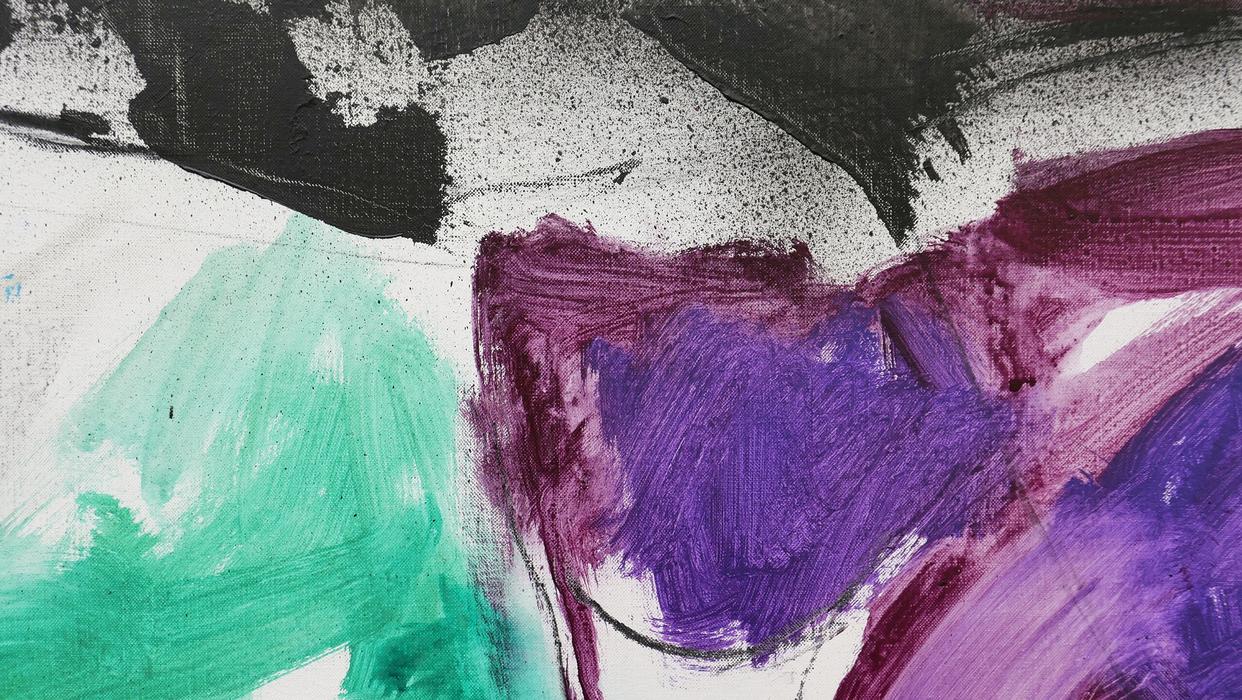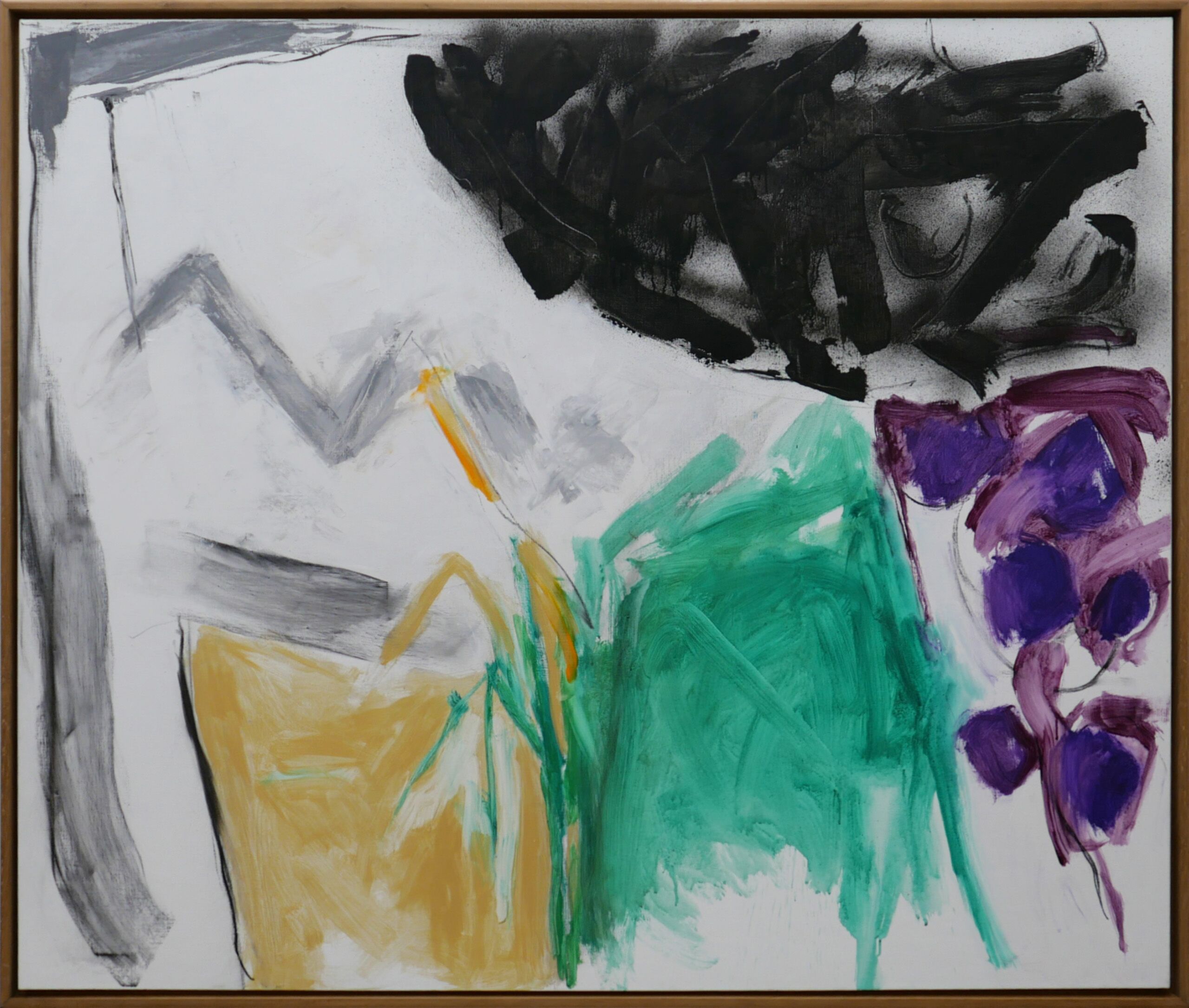 Groot schilderij met abstracte voorstelling van Paul Corvers in acrylverf met toevoeging van houtskool, in eikenhouten baklijst, verso gesigneerd.