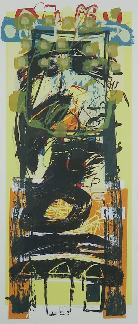 Grote, kleurrijke zeefdruk van Pieter Vermeulen met een geabstraheerde figuur. Het werk is handgesigneerd, genummerd en voorzien van een houten lijst.