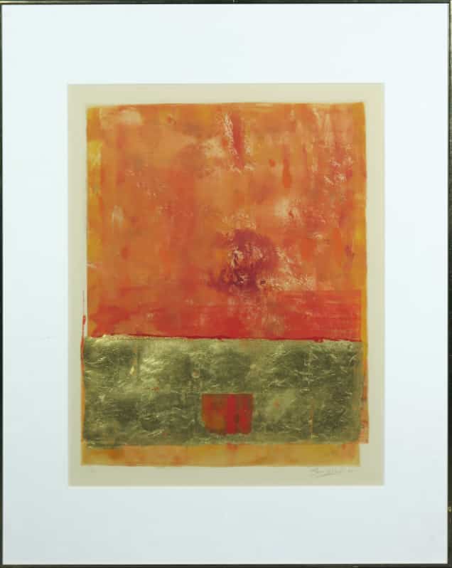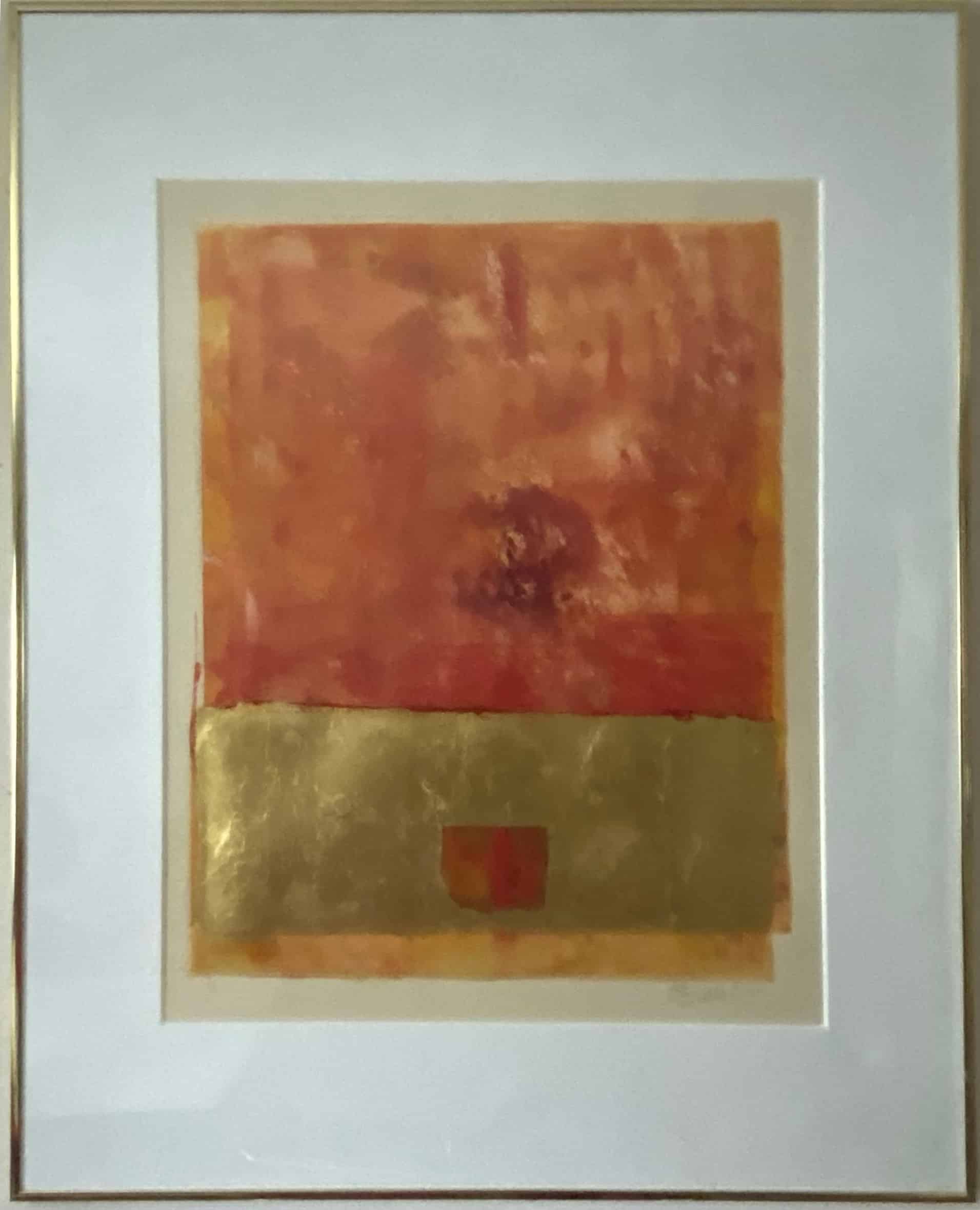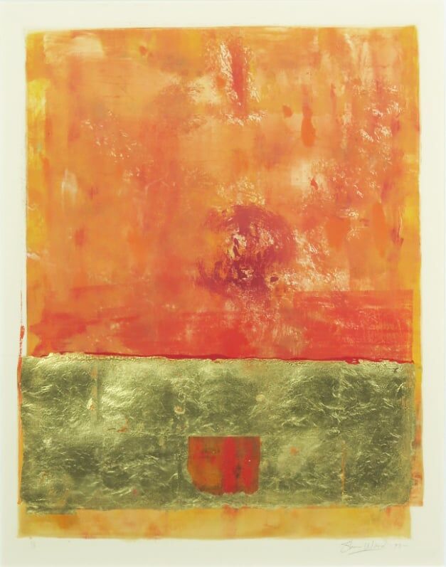 Monoprint met bladgoud zonder titel uit 1993 van de Nederlands-Amerikaanse schilder Steve Wood, ingelijst en handgesigneerd. Oplage: 1 van 1.