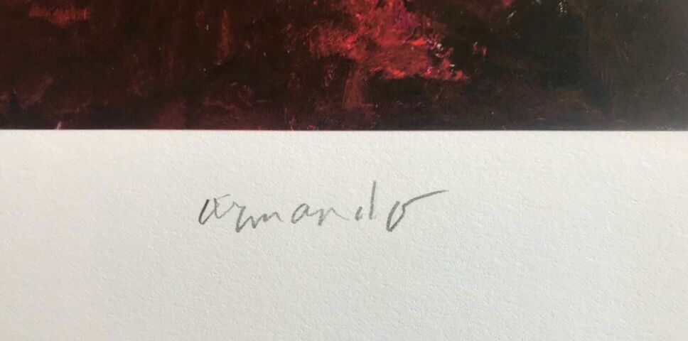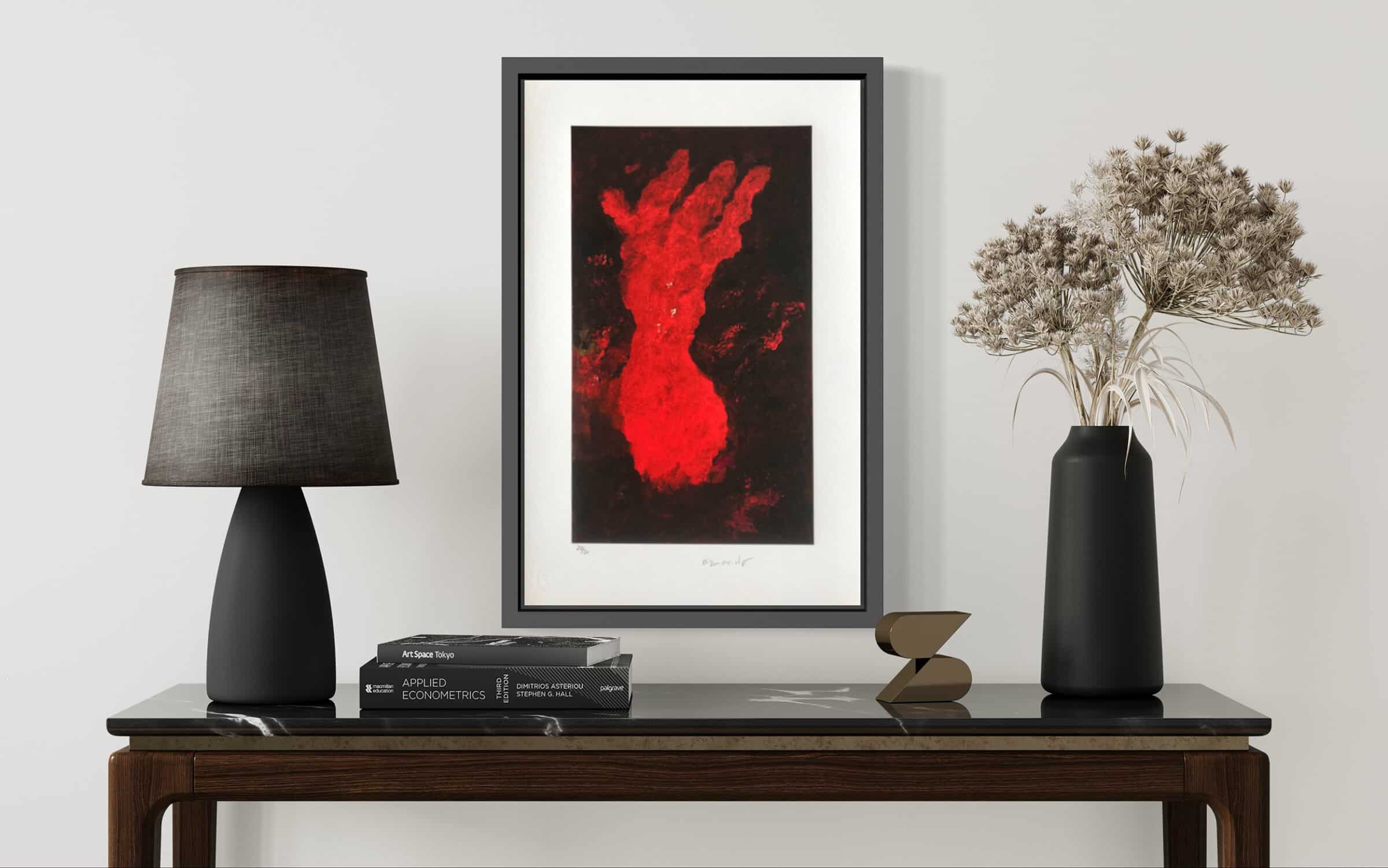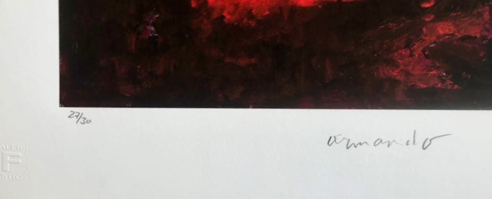 Kleurrijke handgesigneerde giclee “die Hand” (nr. 27 van 30) in rood en zwart van de algemeen bekende kunstenaar Armando.
