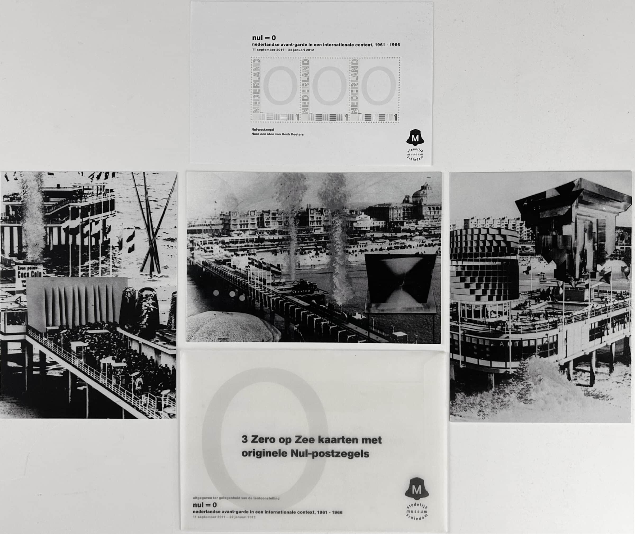 Set van drie Zero op Zee kaarten met originele nul postzegels van Henk Peeters. Bij de Zero op zee kaarten en zegels ook de envelop van de speciale uitgave van het Stedelijk Museum Schiedam.