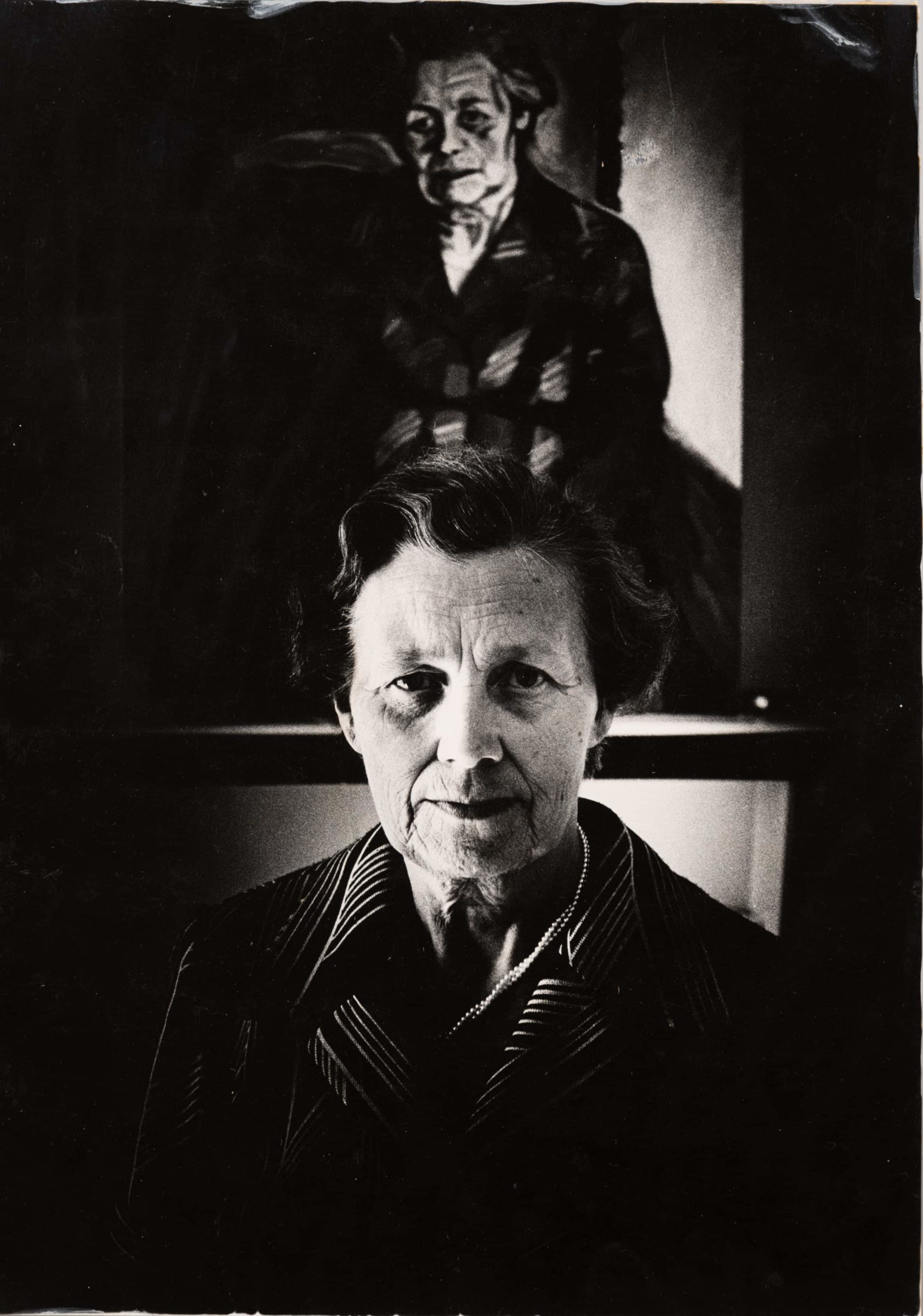 “Mevr. Houkes voor haar eigen portret, 1975” is een foto van Ramon Gieling, uitgevoerd in een eigen druk met een beperkte oplage van 1.