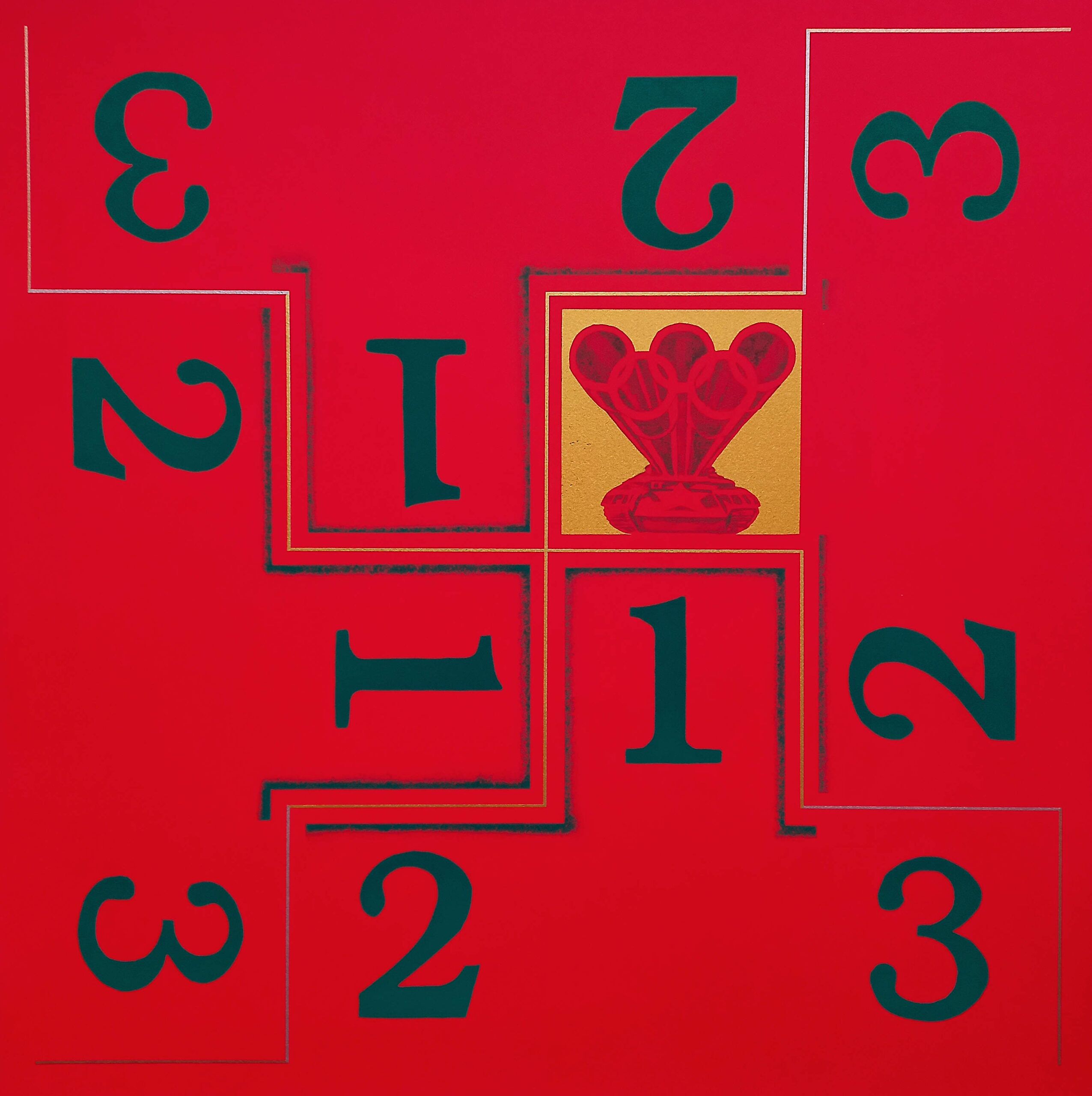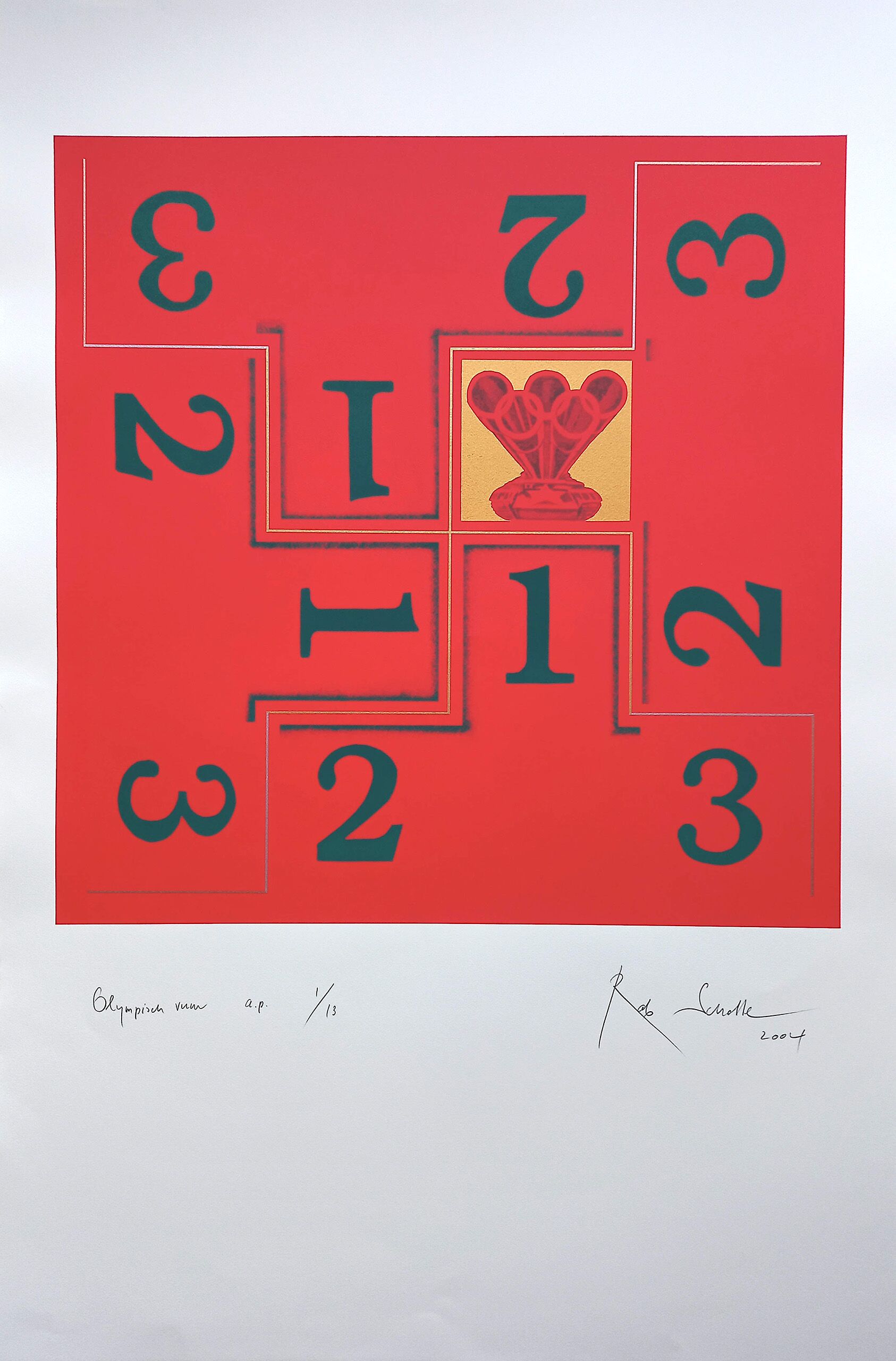 ‘Olympisch vuur’ is een grote zeefdruk van de hand van de bekende kunstenaar Rob Scholte. Het werk is handgesigneerd, genummerd, gedateerd en voorzien van een handgeschreven titel.
