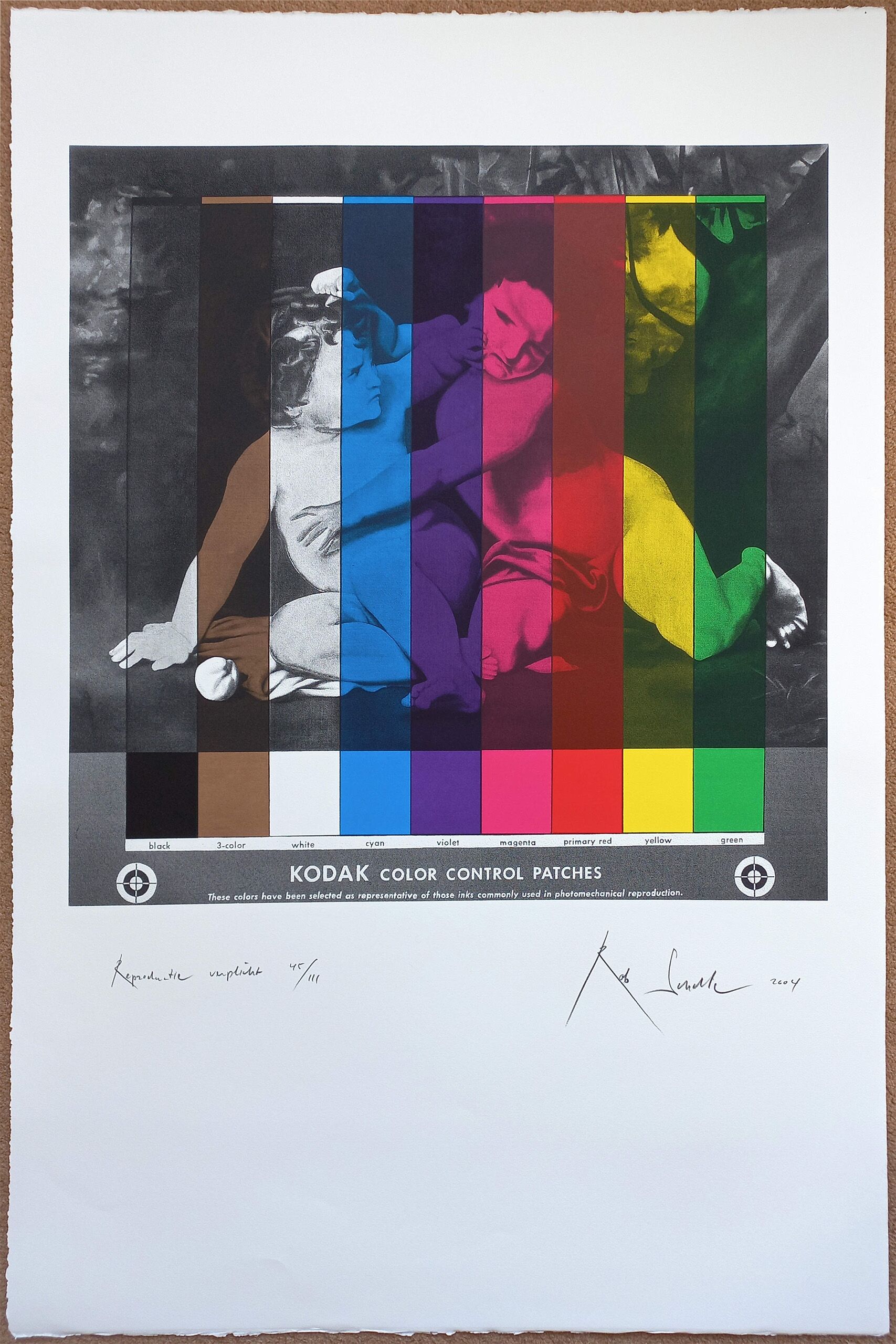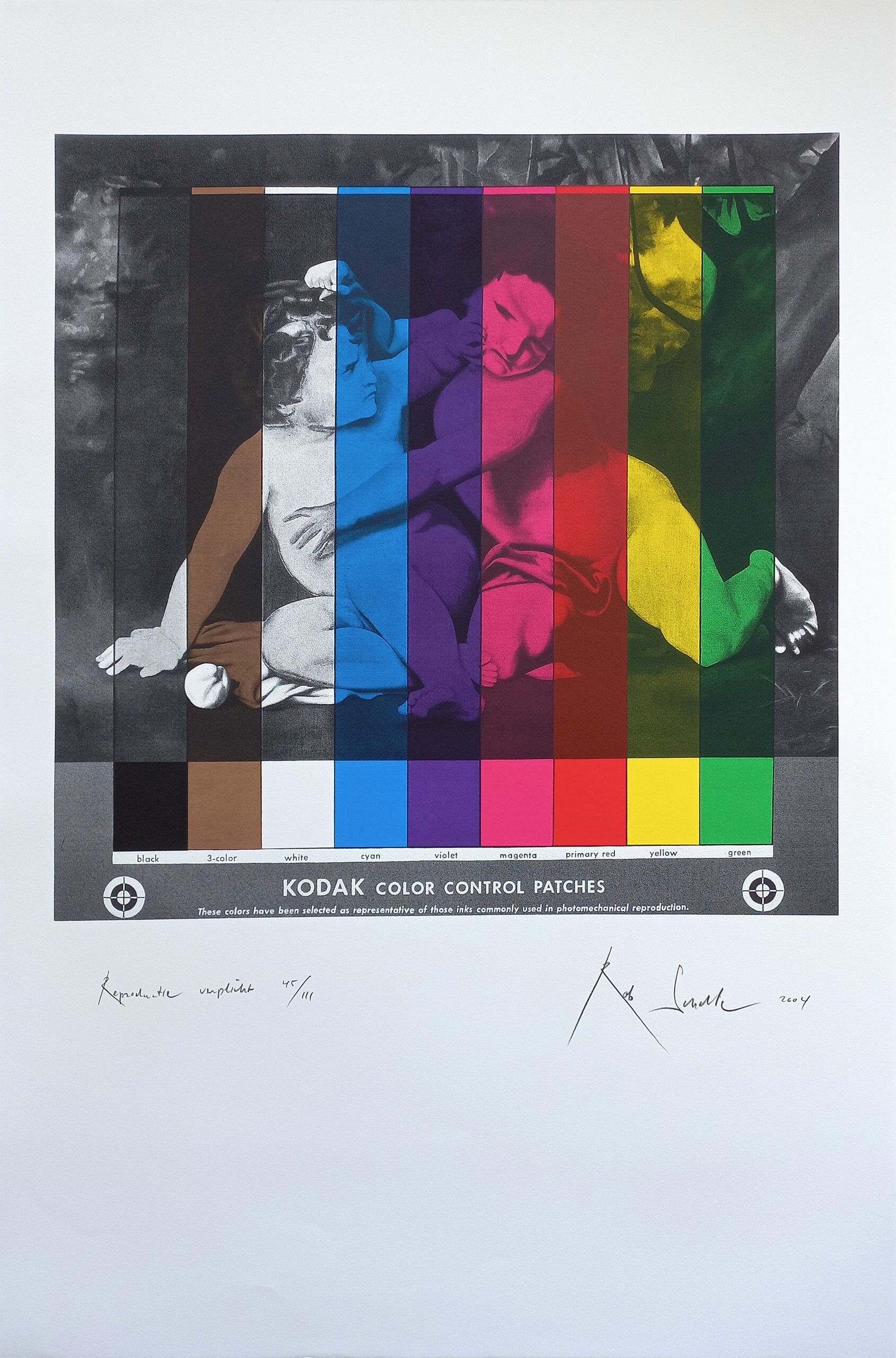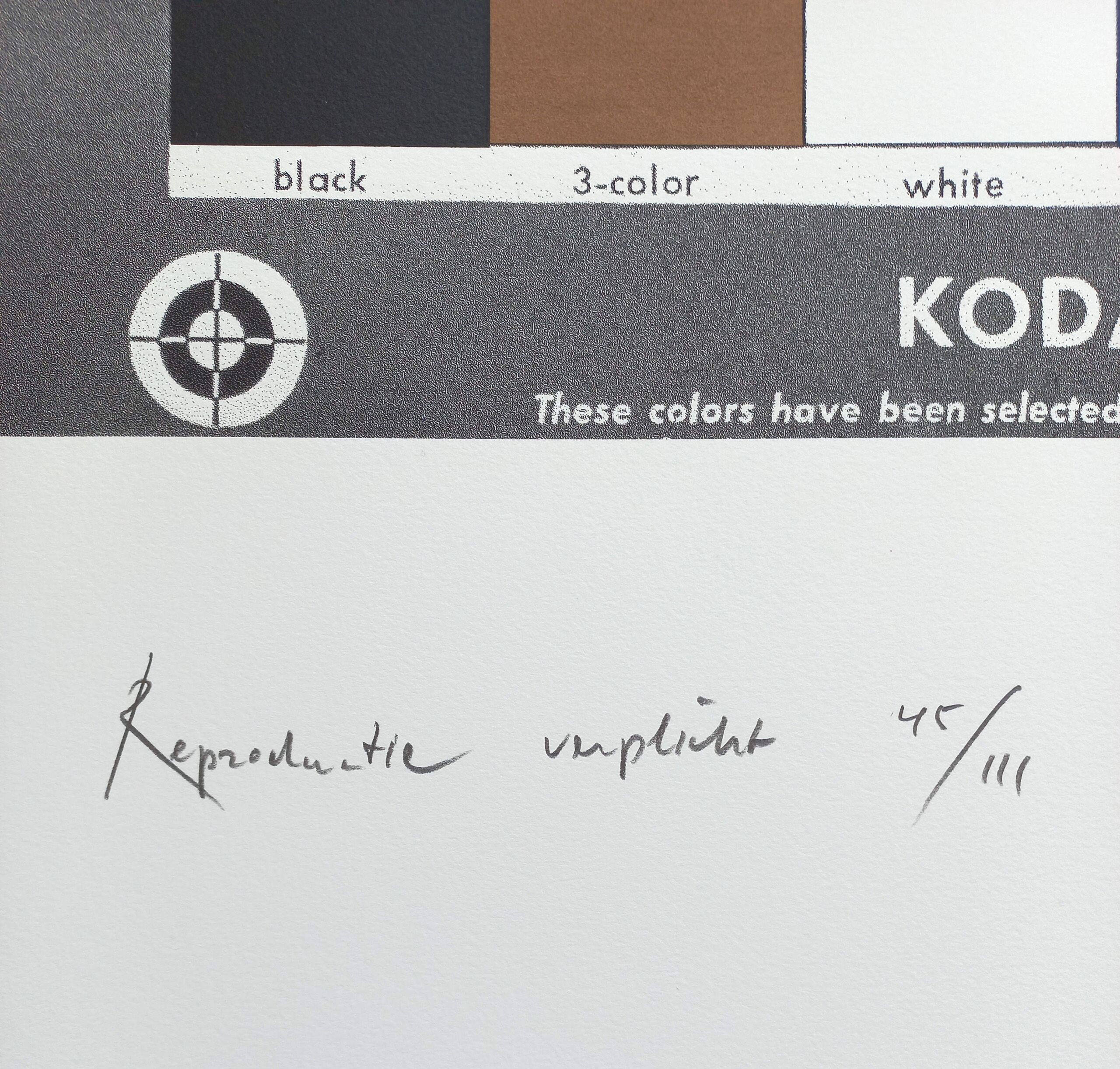 ‘Reproductie verplicht’ is een grote zeefdruk van de hand van de bekende kunstenaar Rob Scholte. Het werk is handgesigneerd, genummerd, gedateerd en voorzien van een handgeschreven titel. Het betreft nummer 45 van 111.