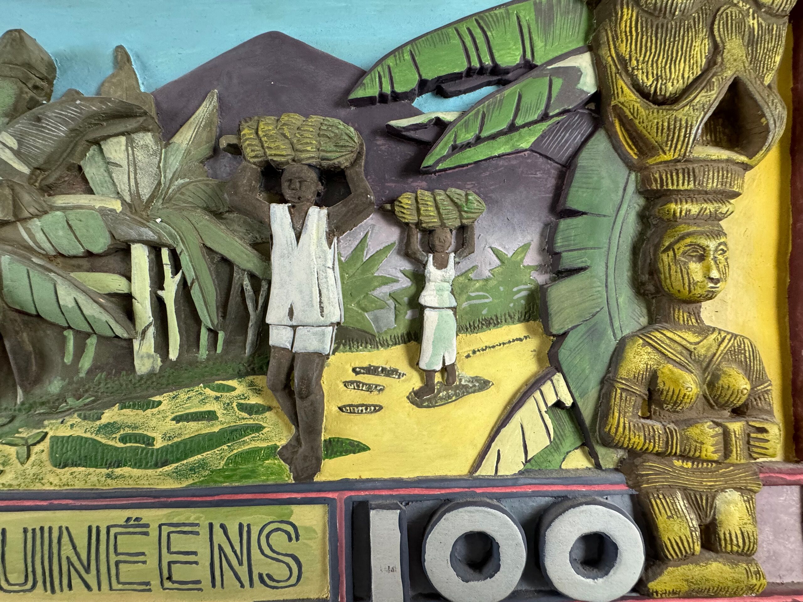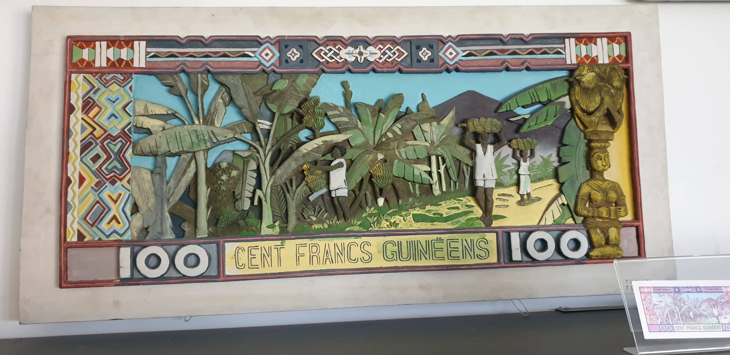 “Centrale Bank Guinee 100 Frs” Achterzijde is een in hardhout gesneden en beschilderd bankbiljet van de bekende Kameroenese kunstenaar Thomas Tchopzan op groot formaat (meer dan een meter breed).