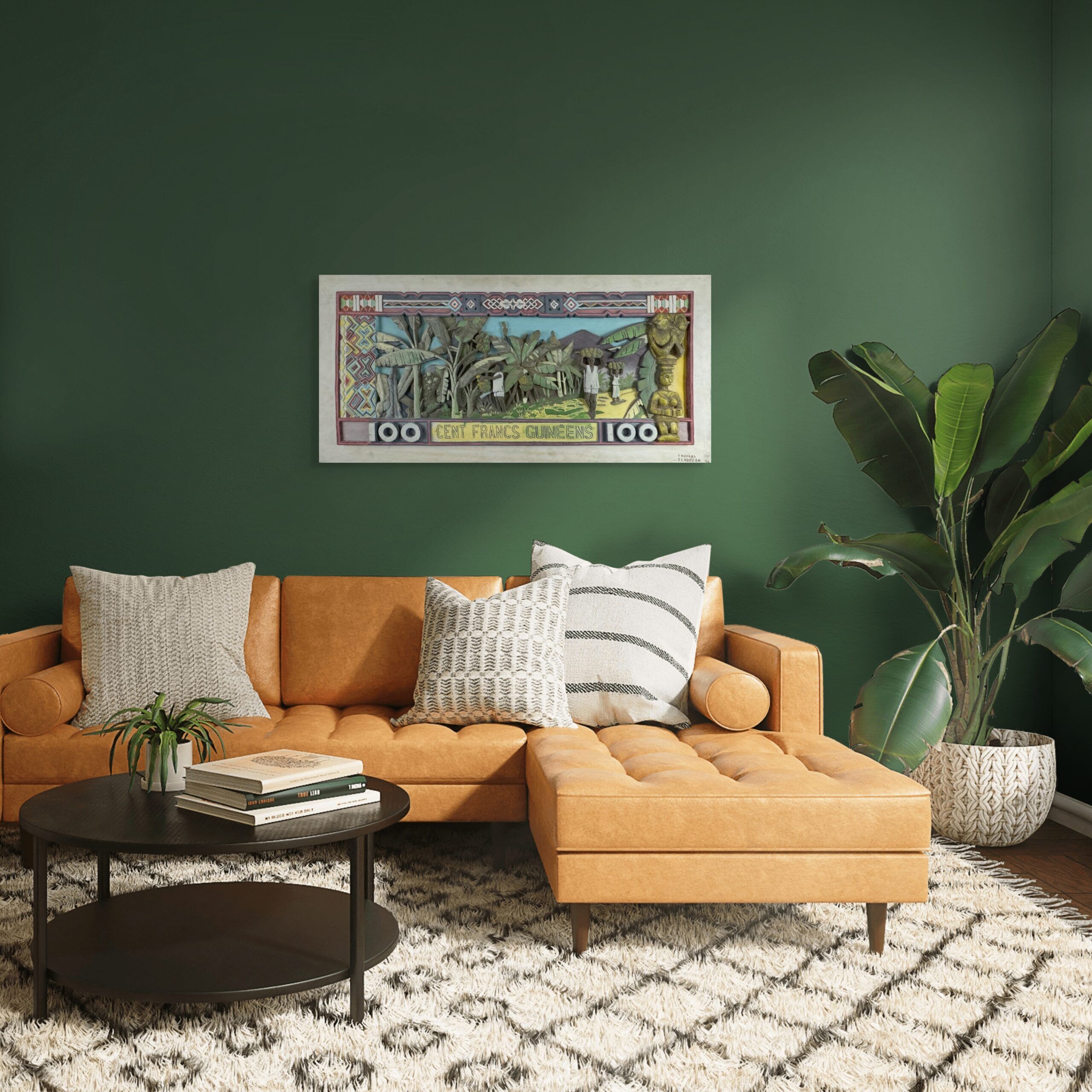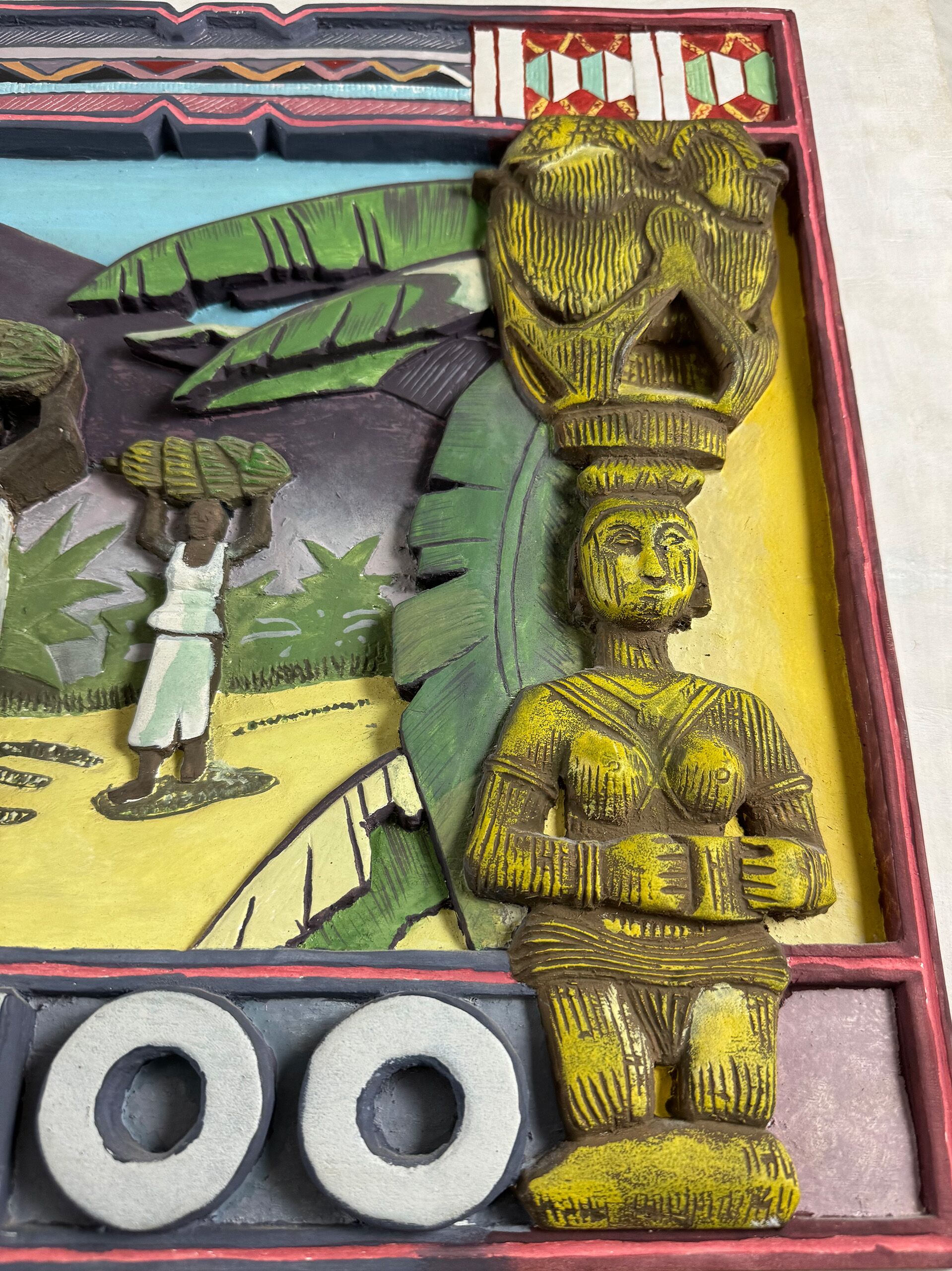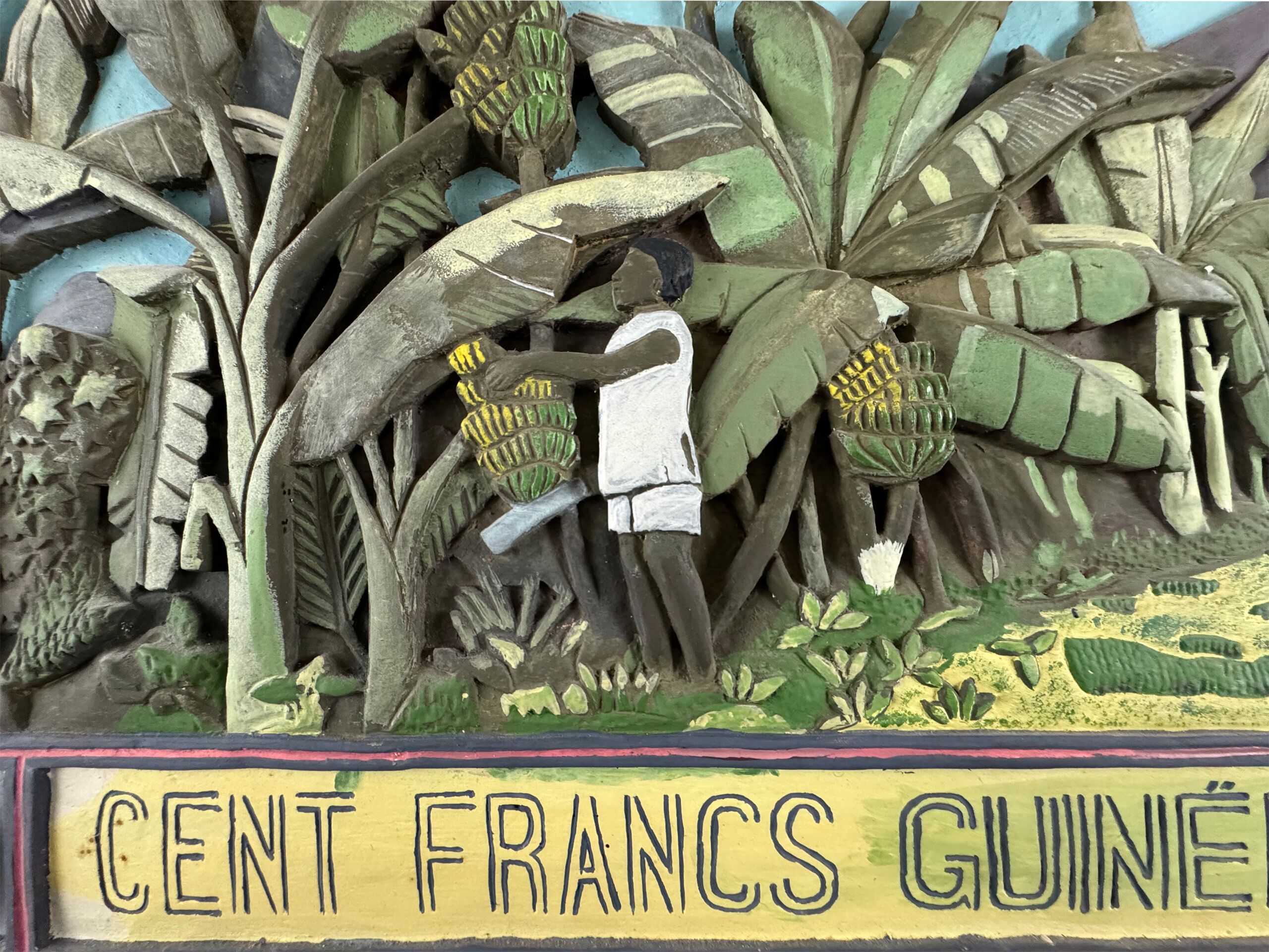 “Centrale Bank Guinee 100 Frs” is een hardhout gesneden en beschilderd bankbiljet van de bekende Kameroenese kunstenaar Thomas Tchopzan op groot formaat (meer dan een meter breed). U krijgt het oorspronkelijke biljet waarnaar het werk is gesneden erbij.