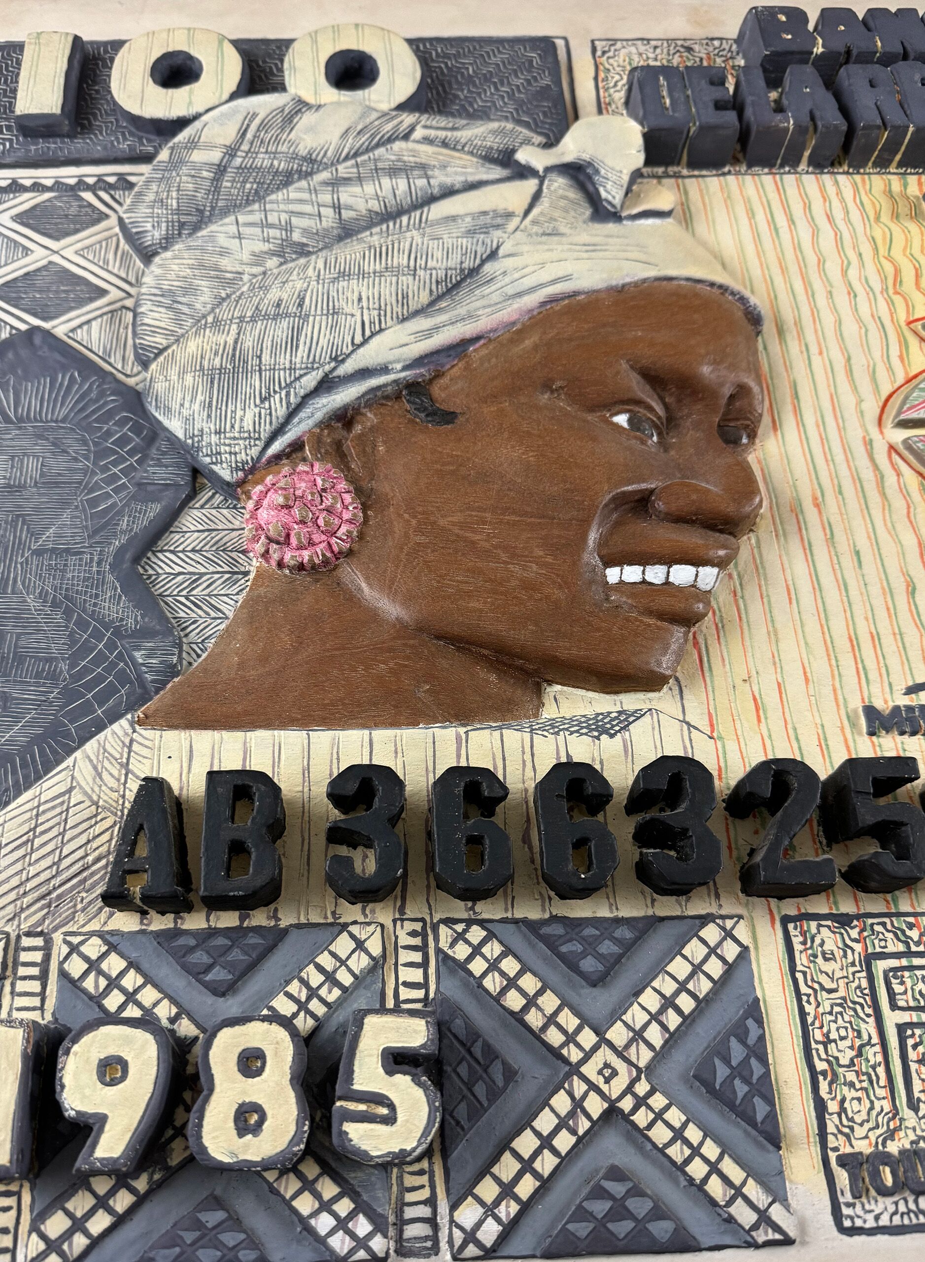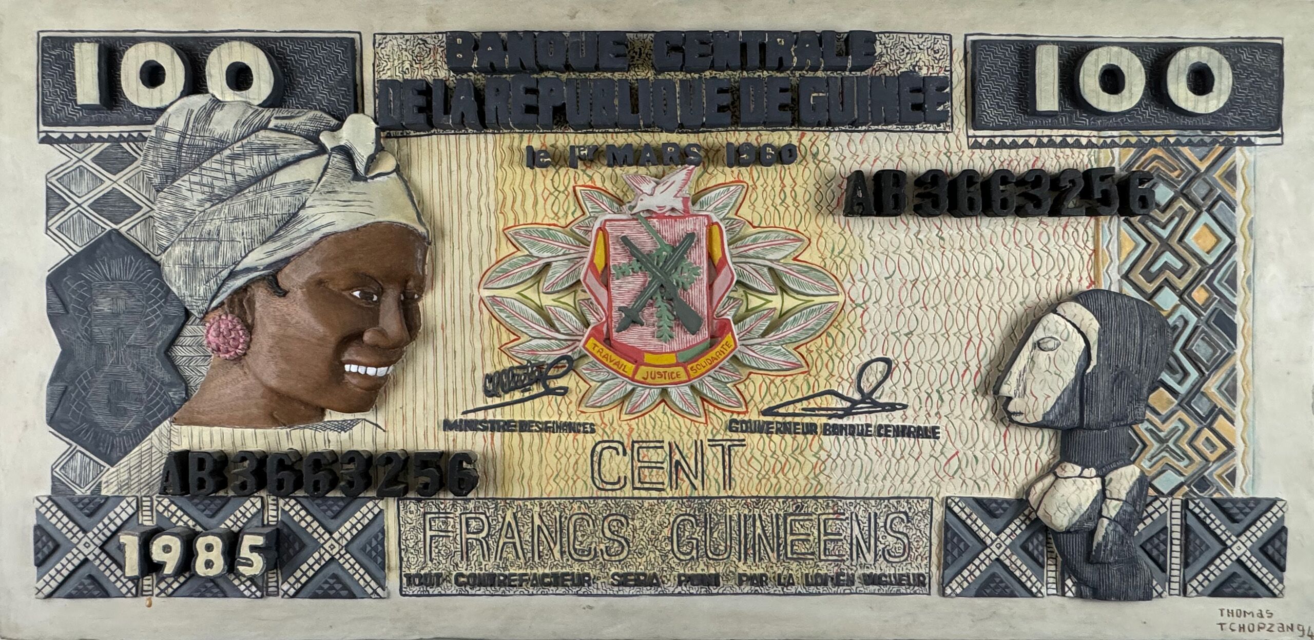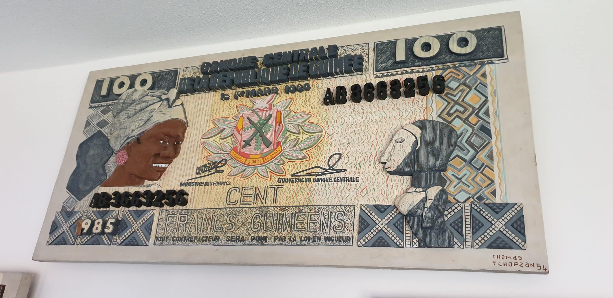 “Centrale Bank Guinee 100 Frs” Voorzijde is een in hardhout gesneden en beschilderd bankbiljet van de bekende Kameroenese kunstenaar Thomas Tchopzan op groot formaat (meer dan een meter breed).