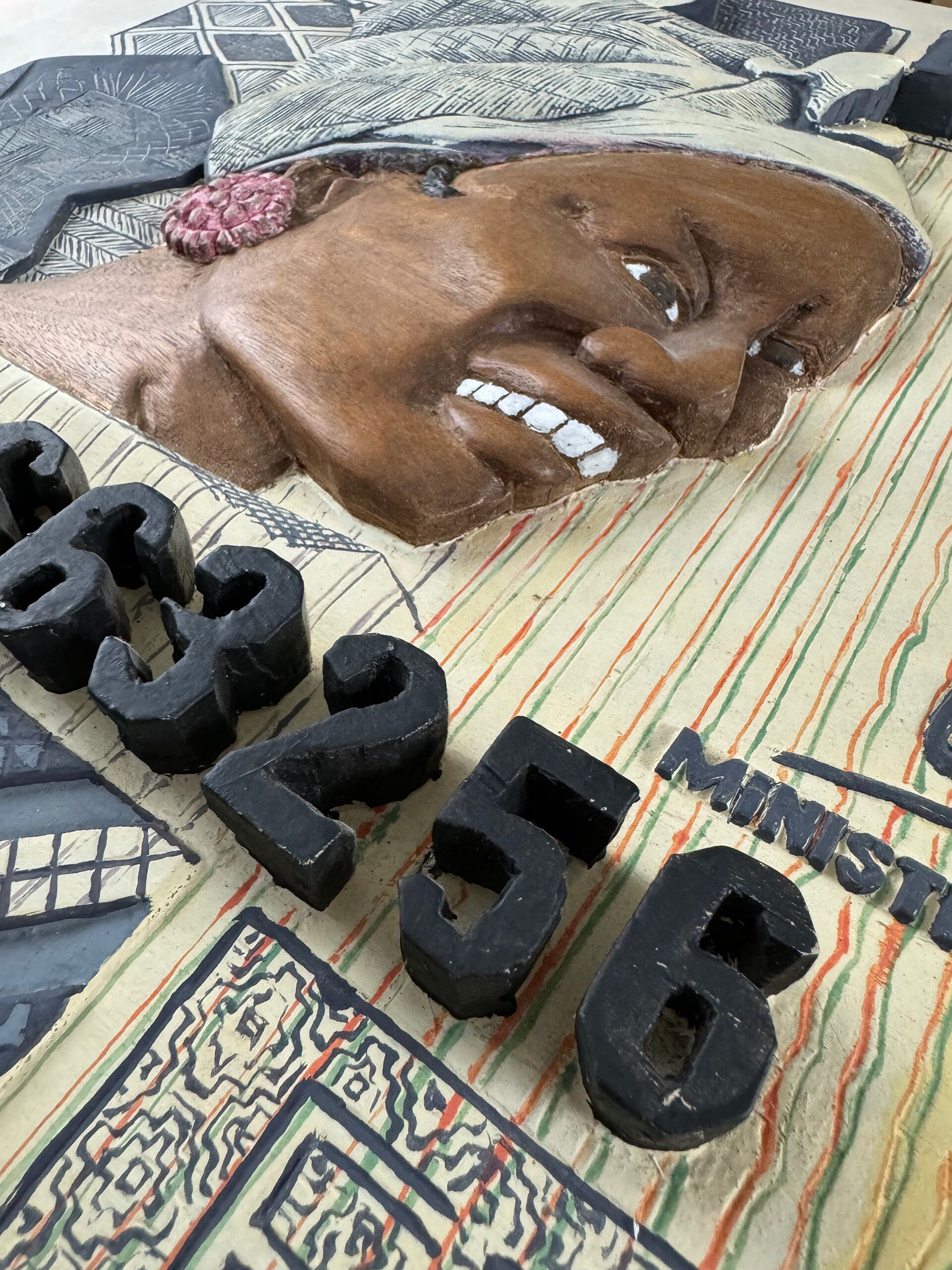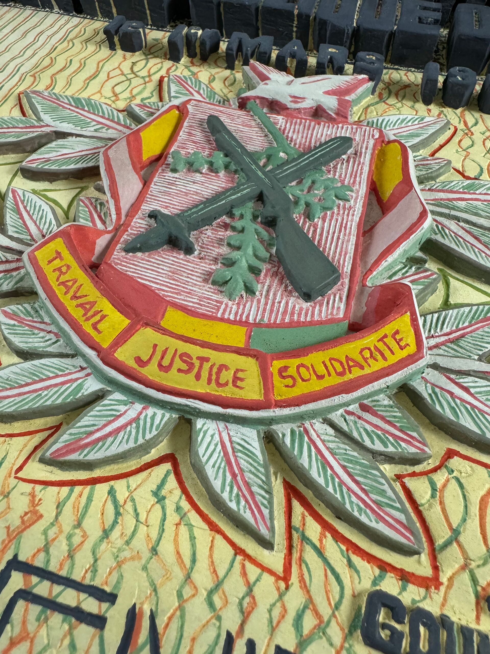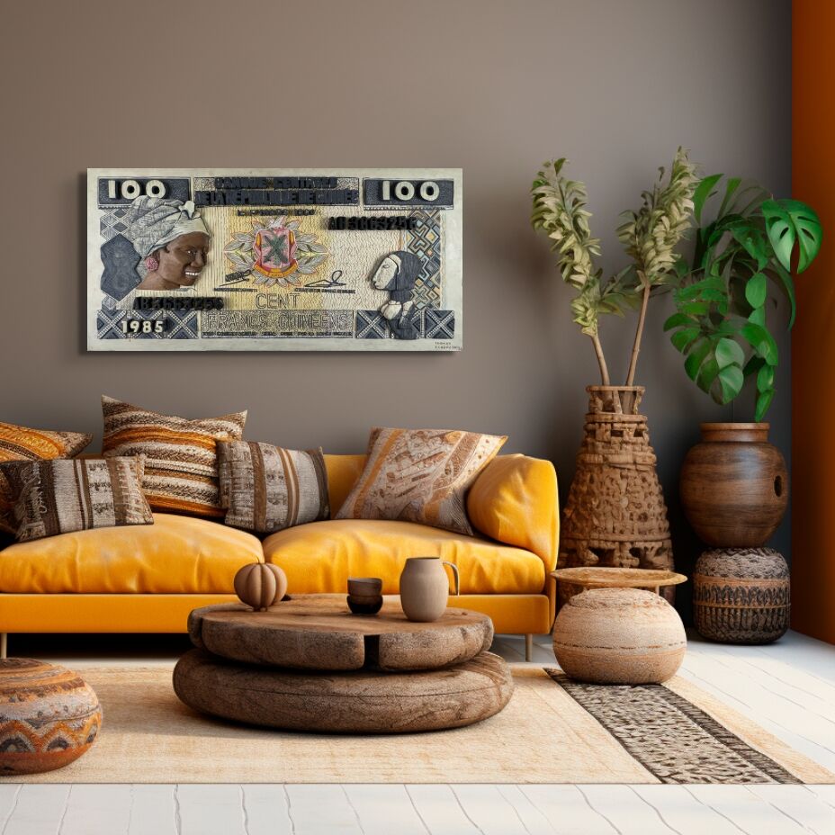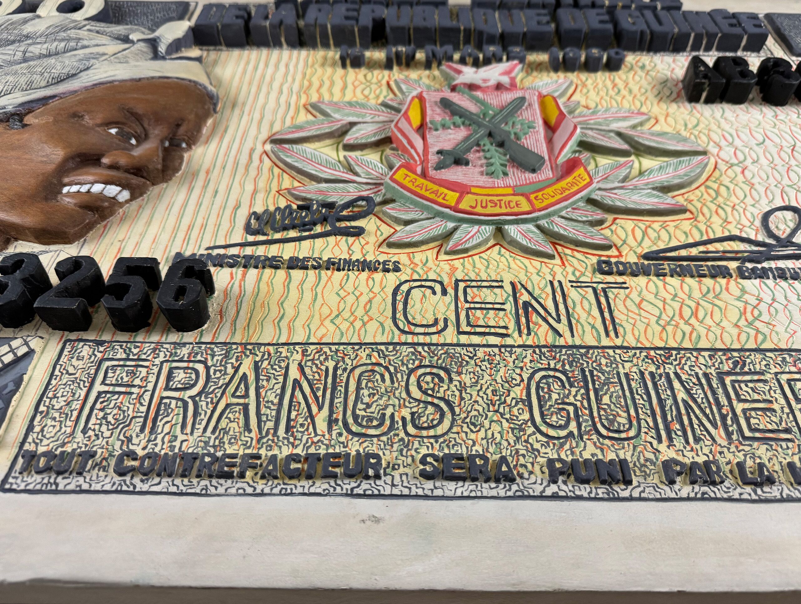 “Centrale Bank Guinee 100 Frs” Voorzijde is een in hardhout gesneden en beschilderd bankbiljet van de bekende Kameroenese kunstenaar Thomas Tchopzan op groot formaat (meer dan een meter breed).