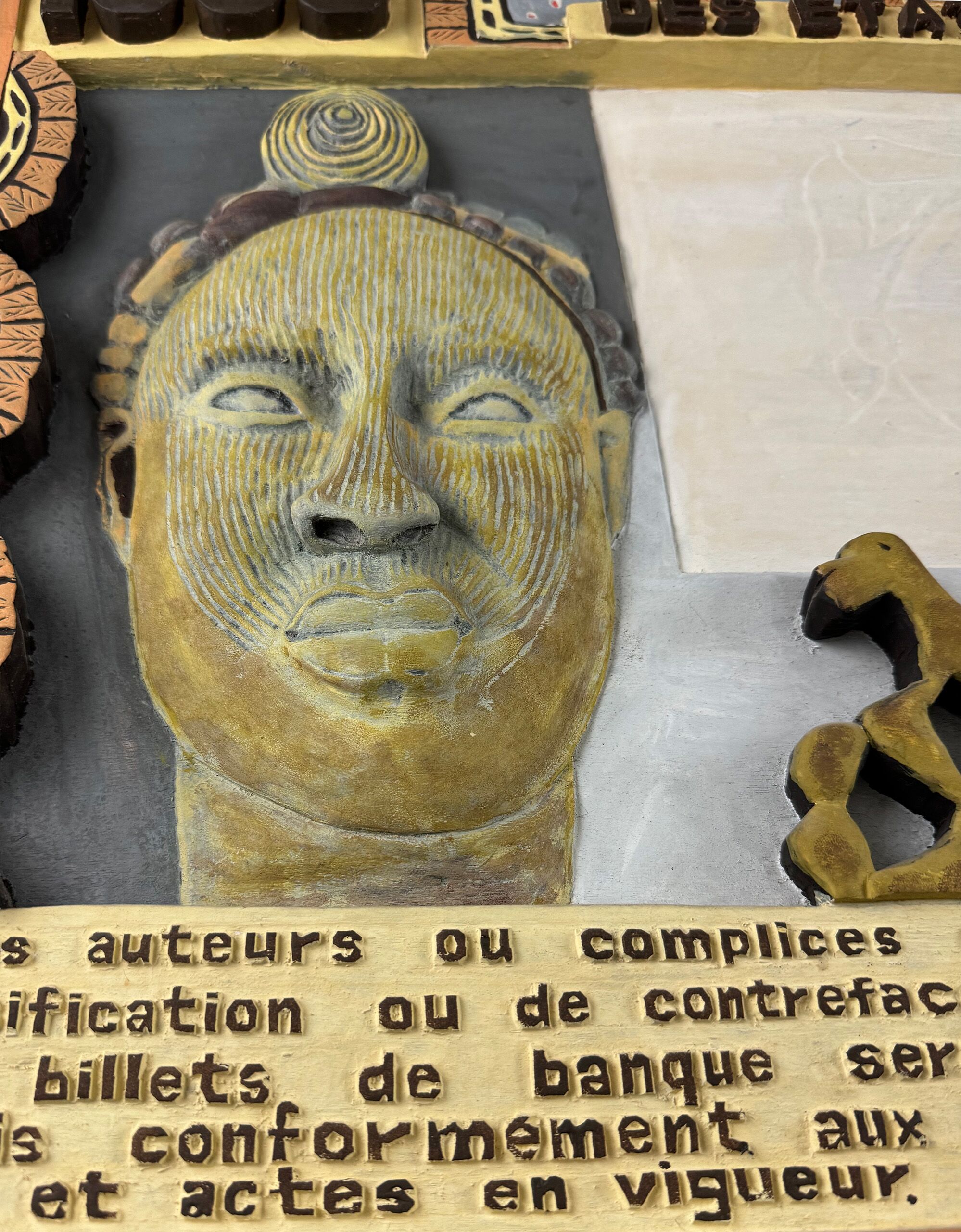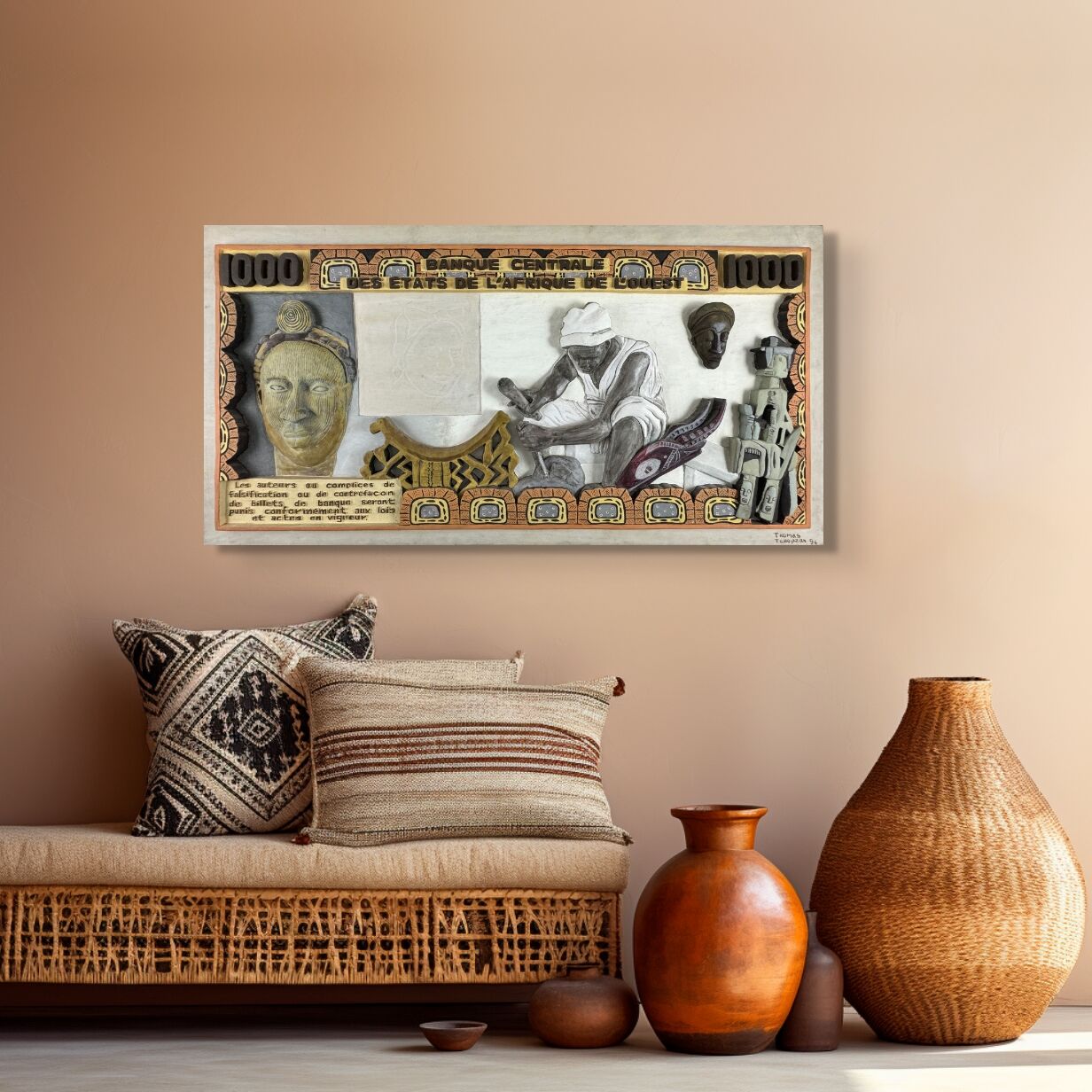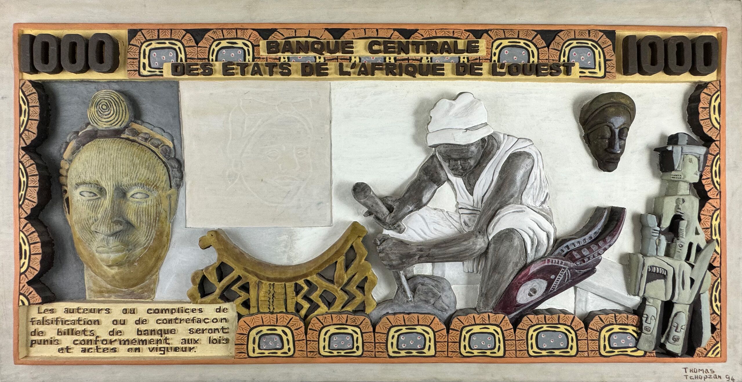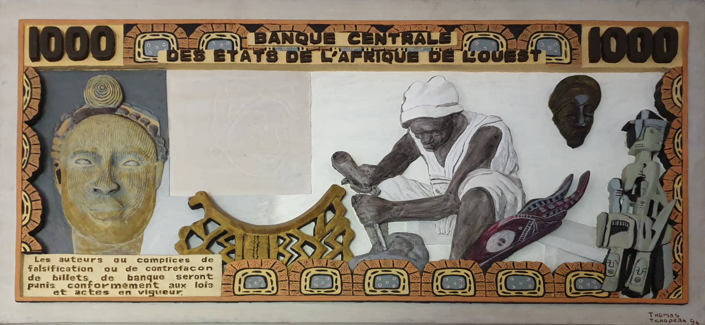 “Centrale Bank West-Afrika 1000 Frs CFA” is een in hardhout gesneden en beschilderd bankbiljet van de bekende Kameroenese kunstenaar Thomas Tchopzan op groot formaat (meer dan een meter breed).