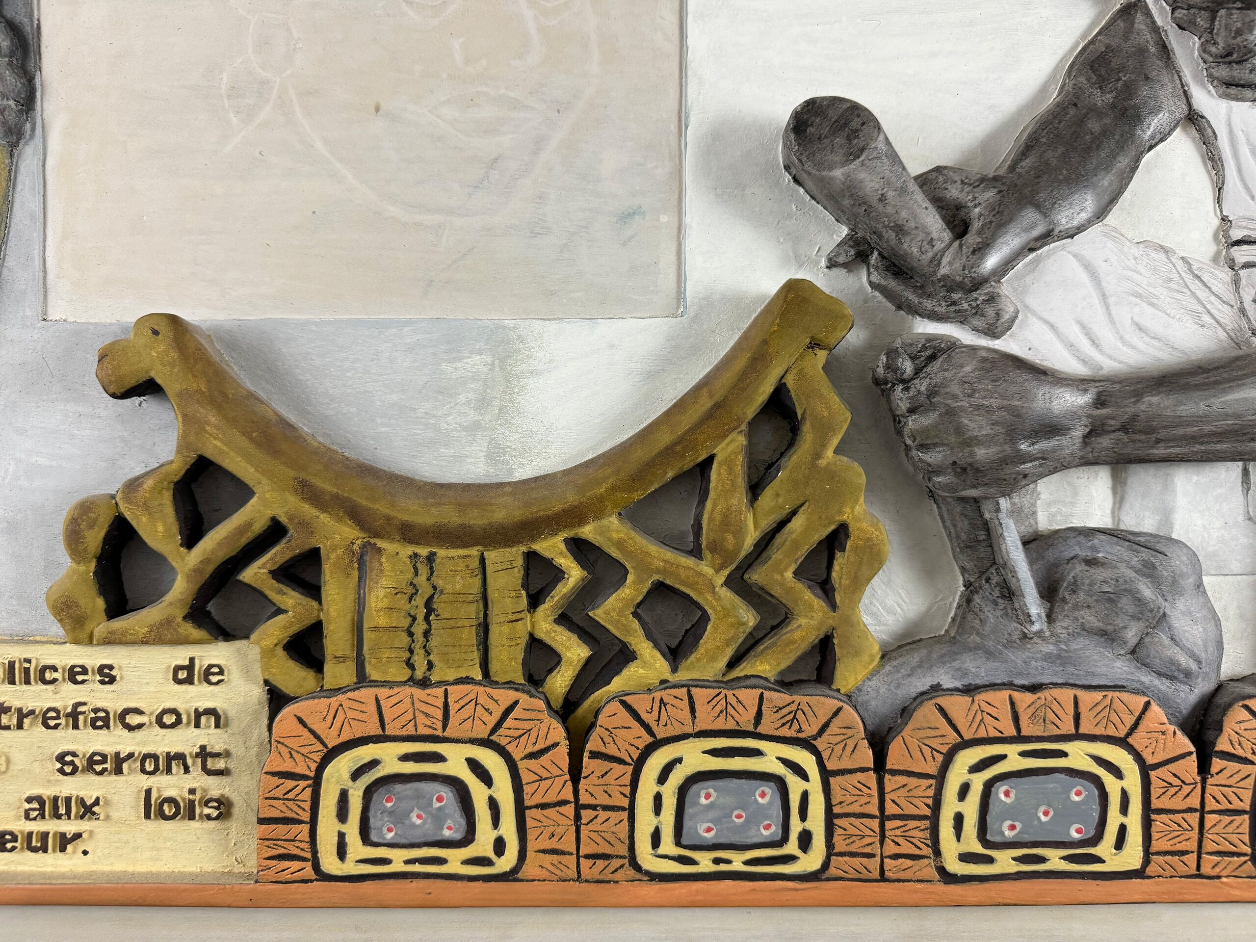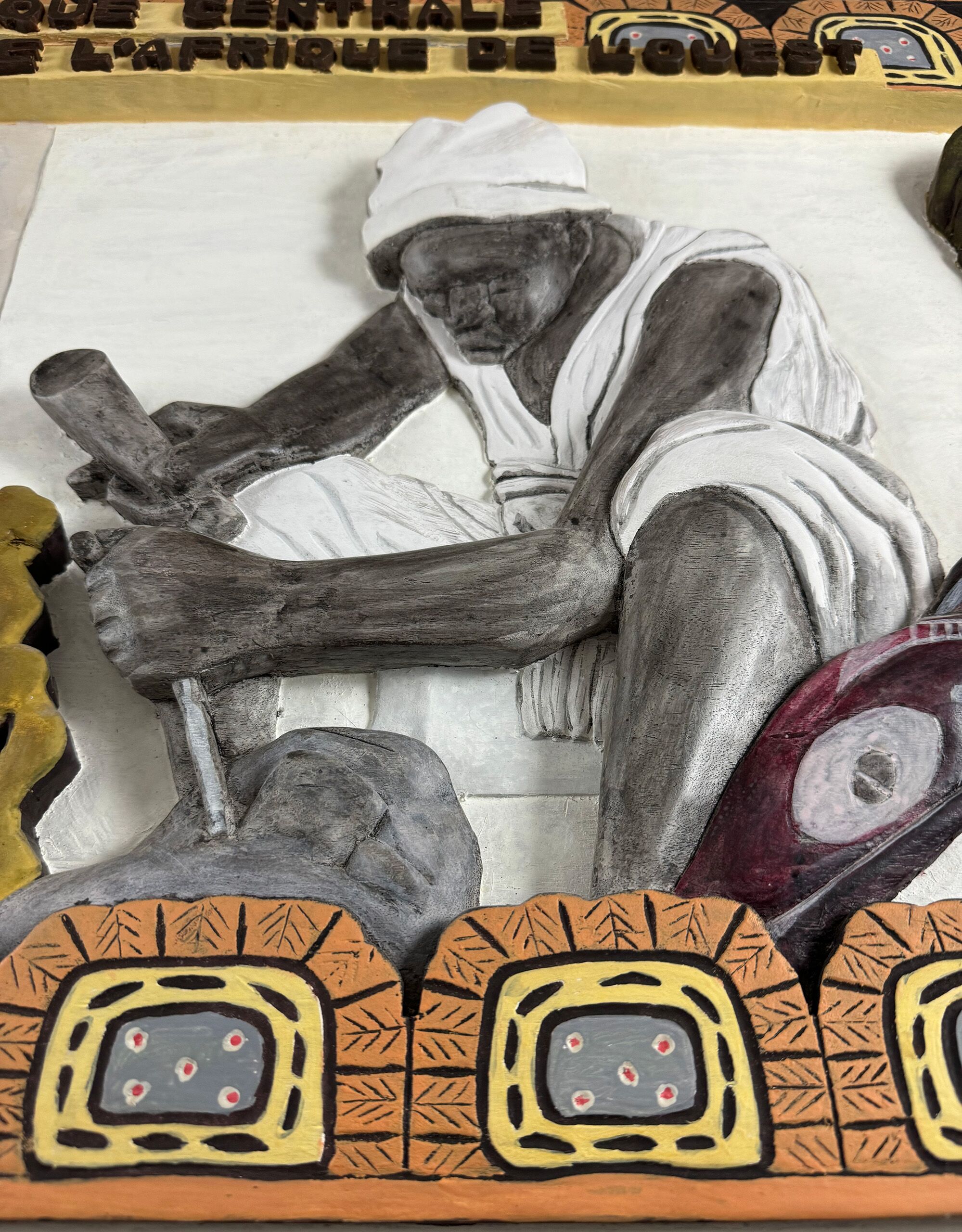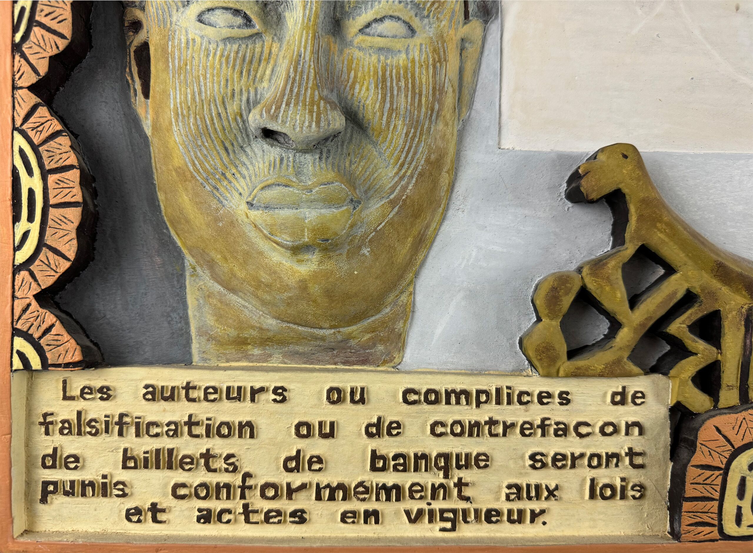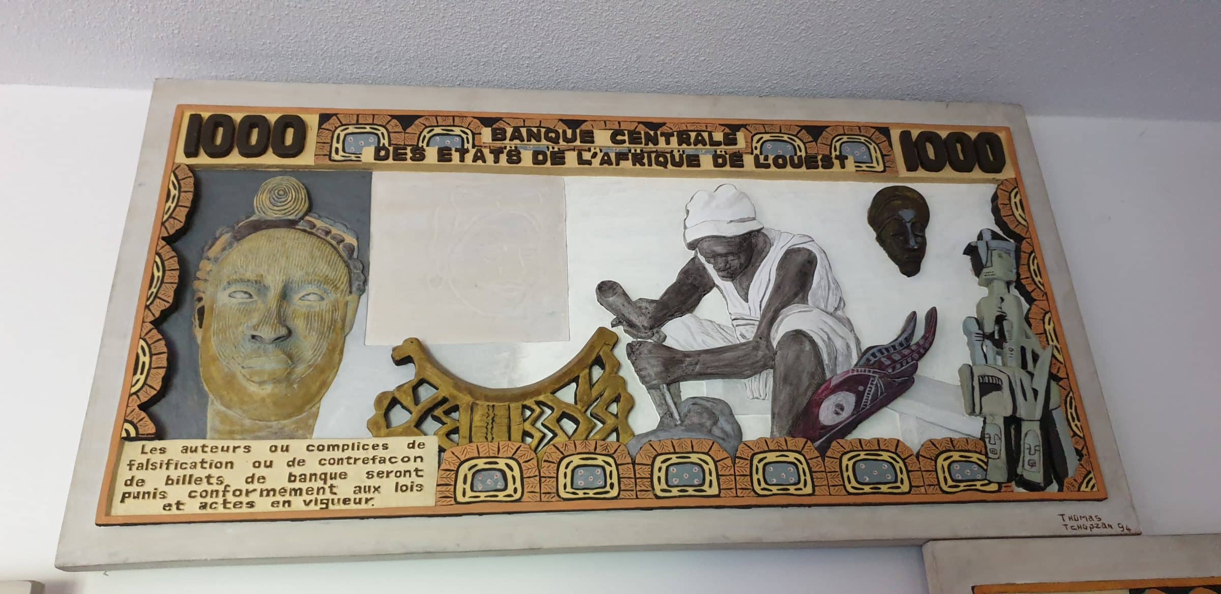 “Centrale Bank West-Afrika 1000 Frs CFA” is een in hardhout gesneden en beschilderd bankbiljet van de bekende Kameroenese kunstenaar Thomas Tchopzan op groot formaat (meer dan een meter breed).