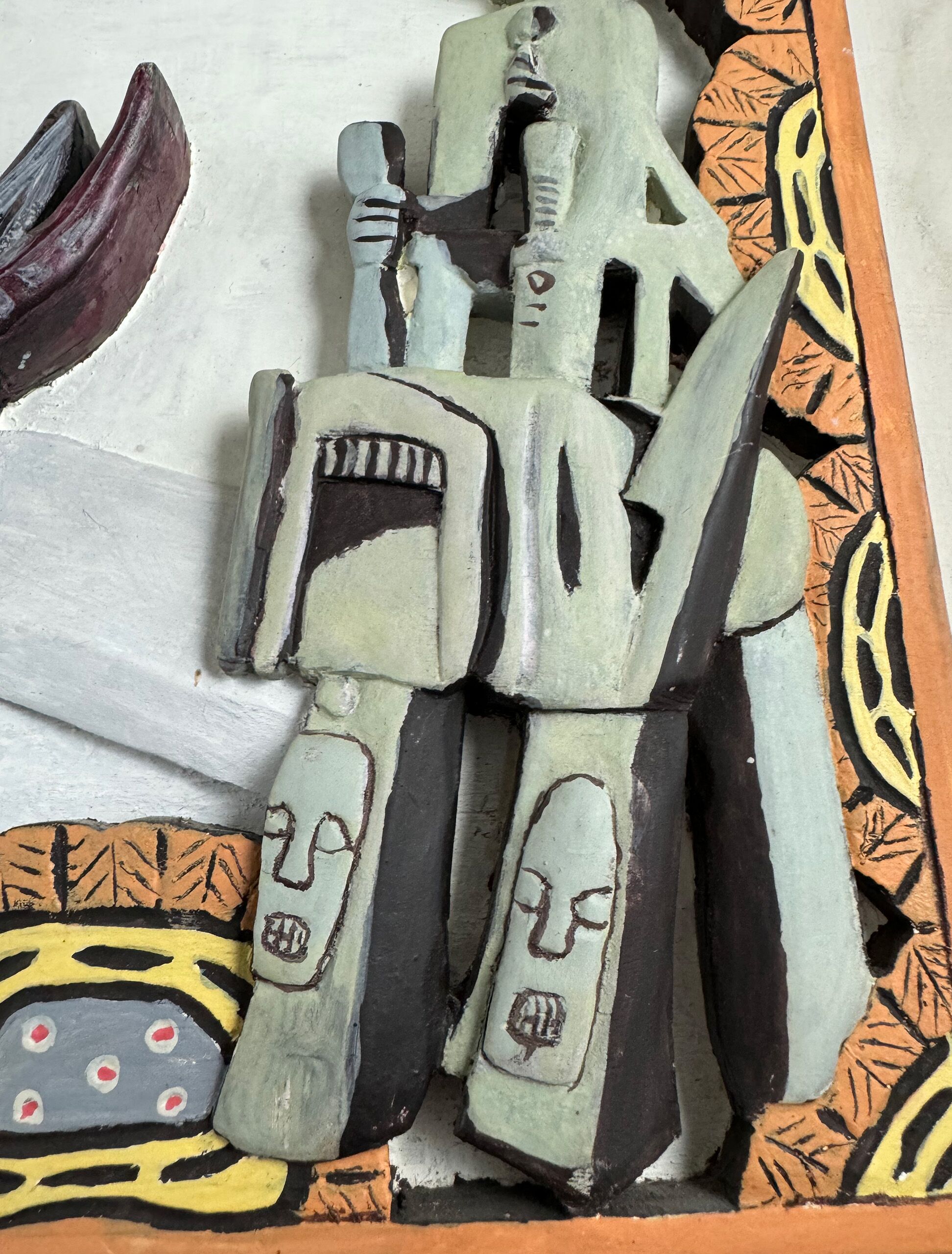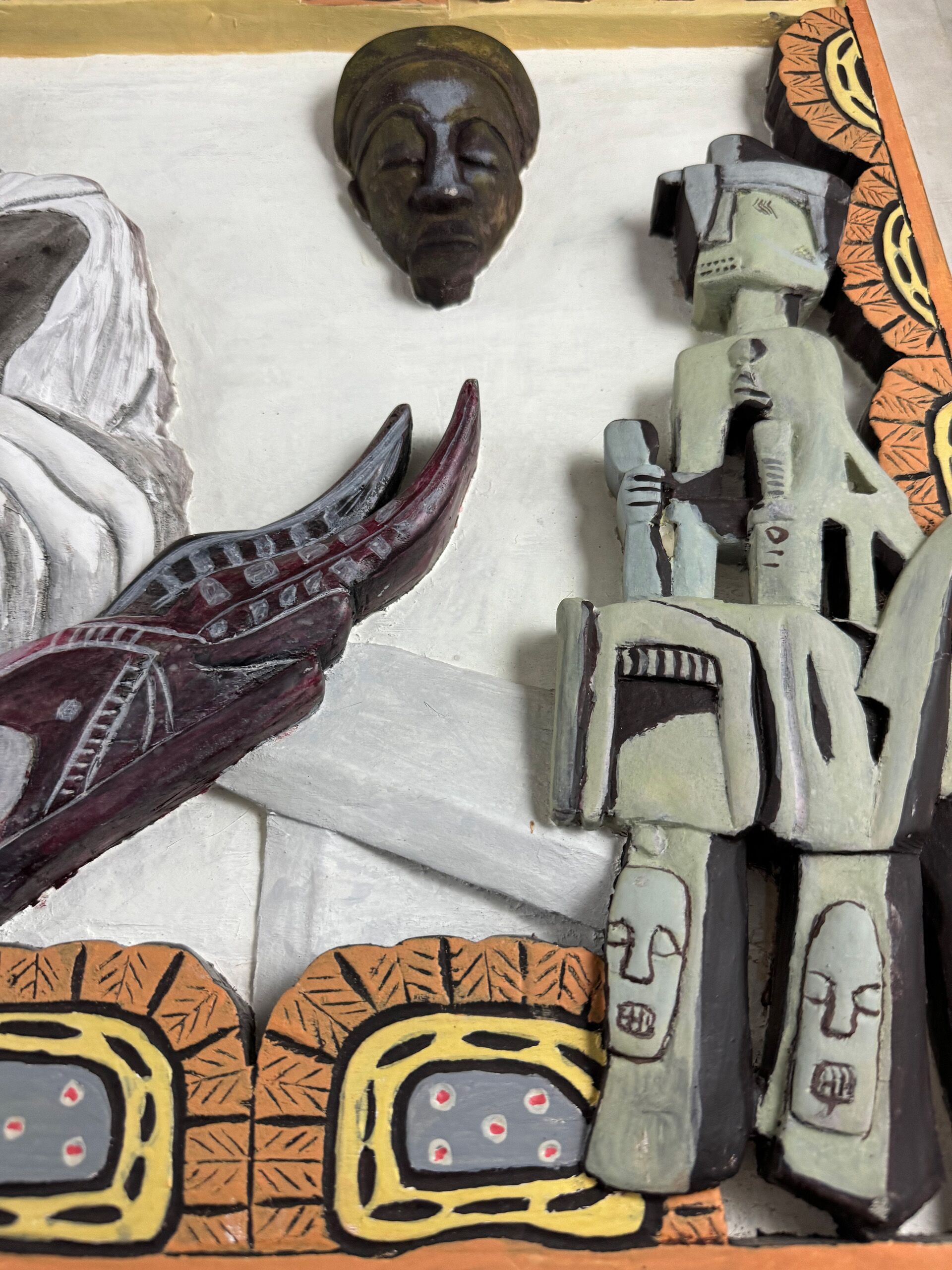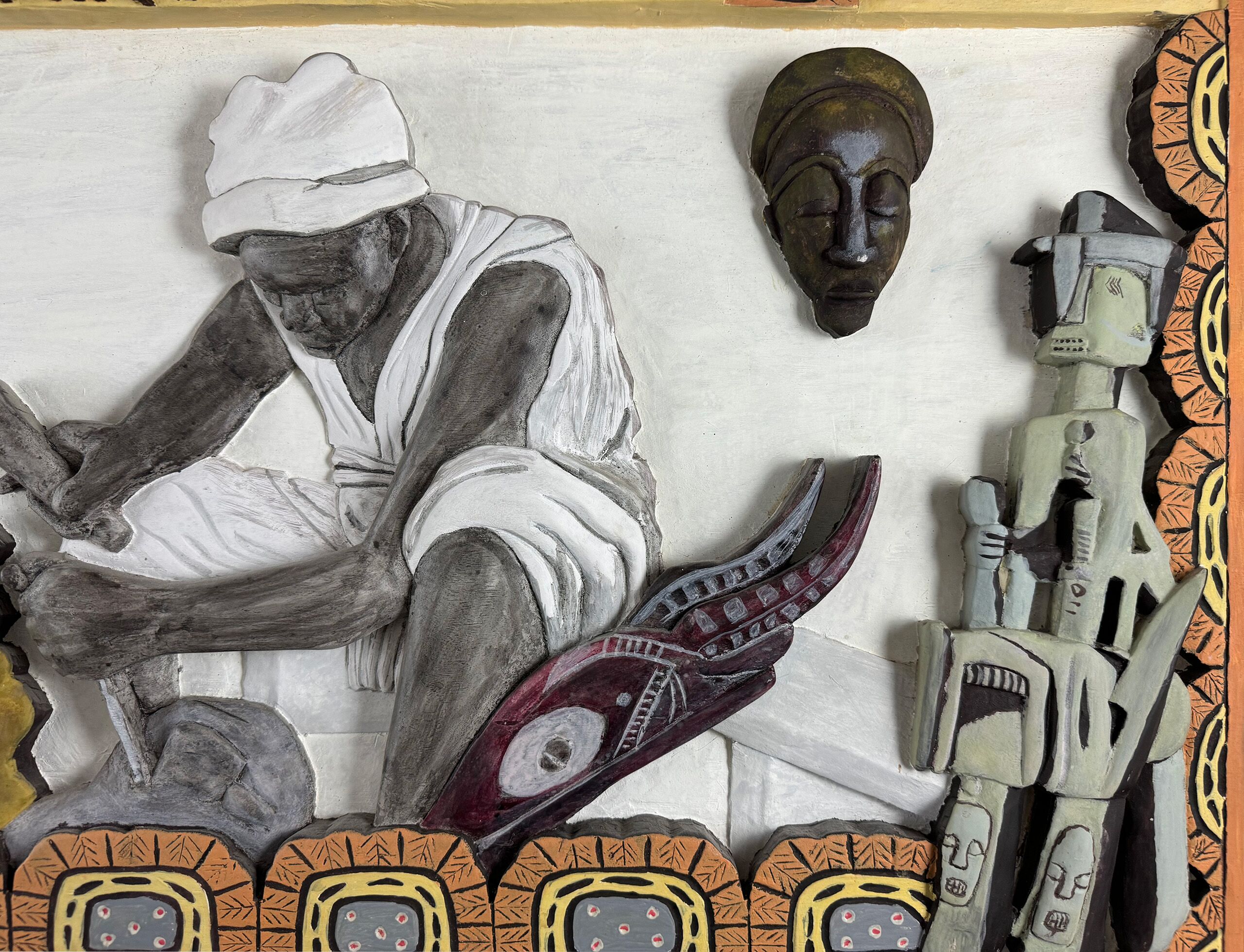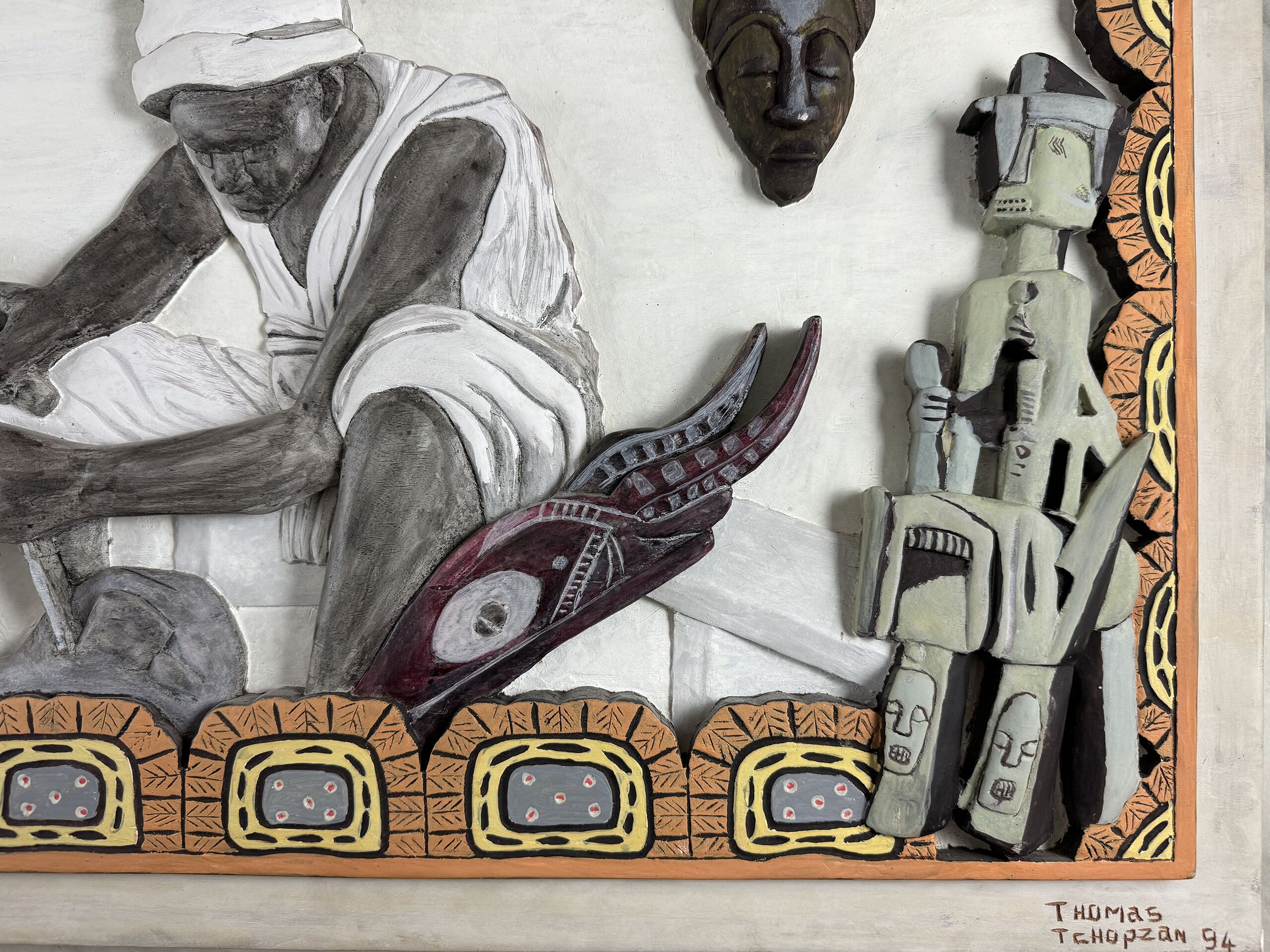 “Centrale Bank West-Afrika 1000 Frs CFA” is een in hardhout gesneden en beschilderd bankbiljet van de bekende Kameroenese kunstenaar Thomas Tchopzan op groot formaat (meer dan een meter breed).